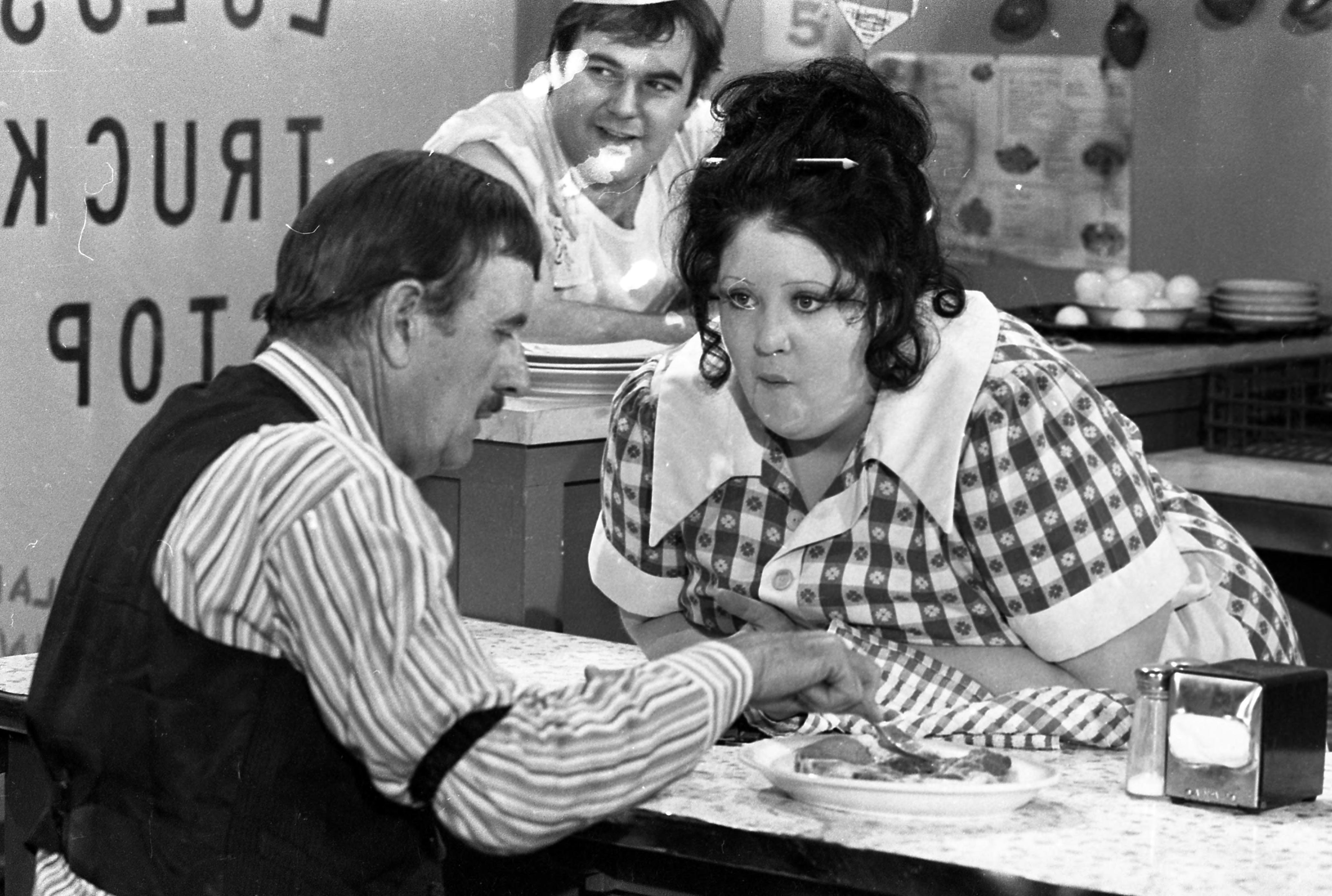 Evansville Courier photographer Sonny Brown was a friend of Hee Haw cast member Grandpa Jones, who was born in Niagara, KY (in Henderson County---just across the river from Evansville, IN) and thus was able to visit the set and take lots of backstage photographs. Here are Lulu Roman, Archie Campbell, and an unknown actor.