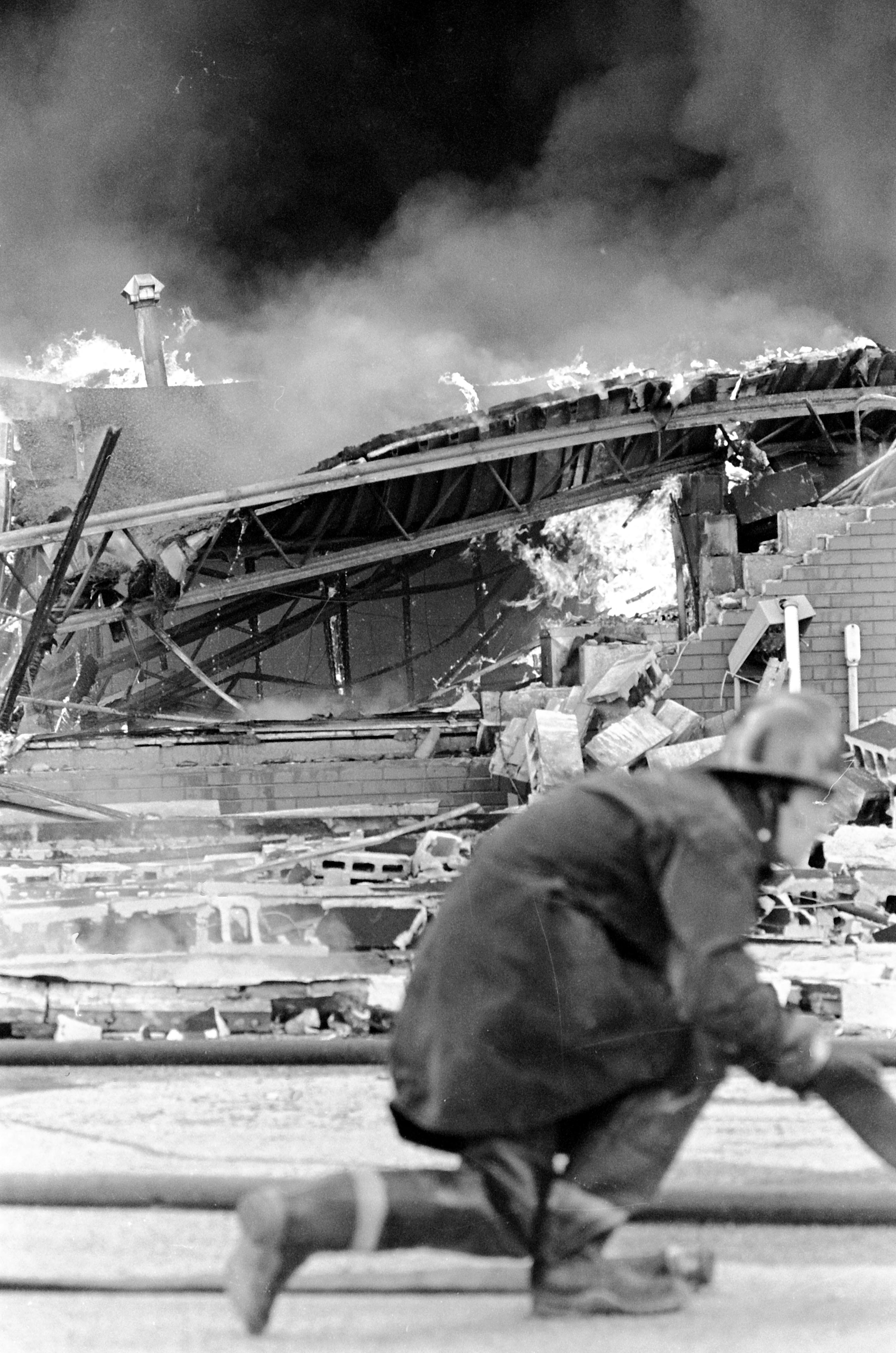 Evansville firefighters on the scene of a 3 alarm fire at A-W-D Inc. (auto parts) at 772 Division St., with an Evansville firefighter atop a portion of the burning building.