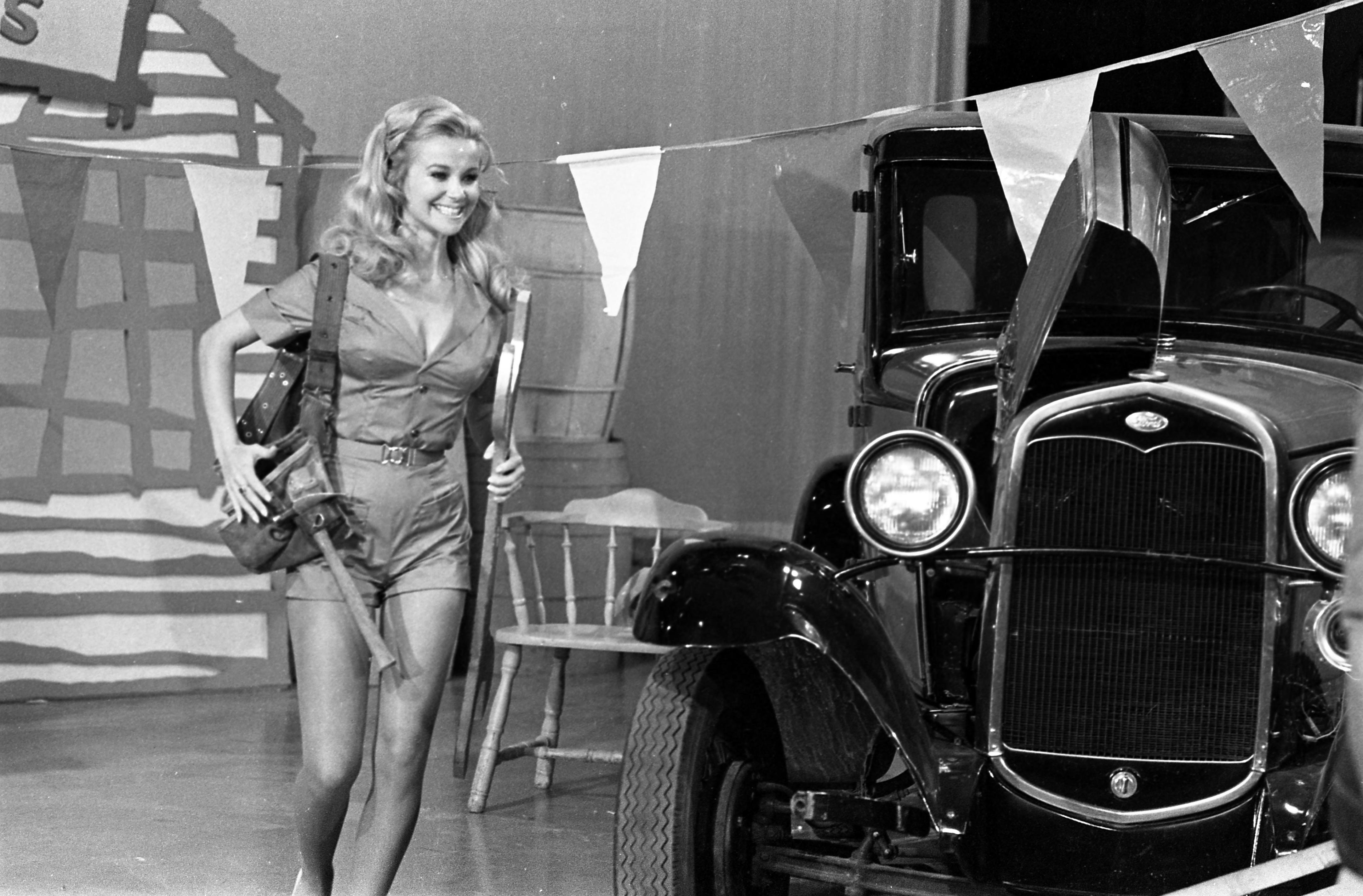 Evansville Courier photographer Sonny Brown was a friend of Hee Haw cast member Grandpa Jones, who was born in Niagara, KY (in Henderson County---just across the river from Evansville, IN) and thus was able to visit the set and take lots of backstage photographs. Here is one of the Hee Haw Honeys near an old Ford car.