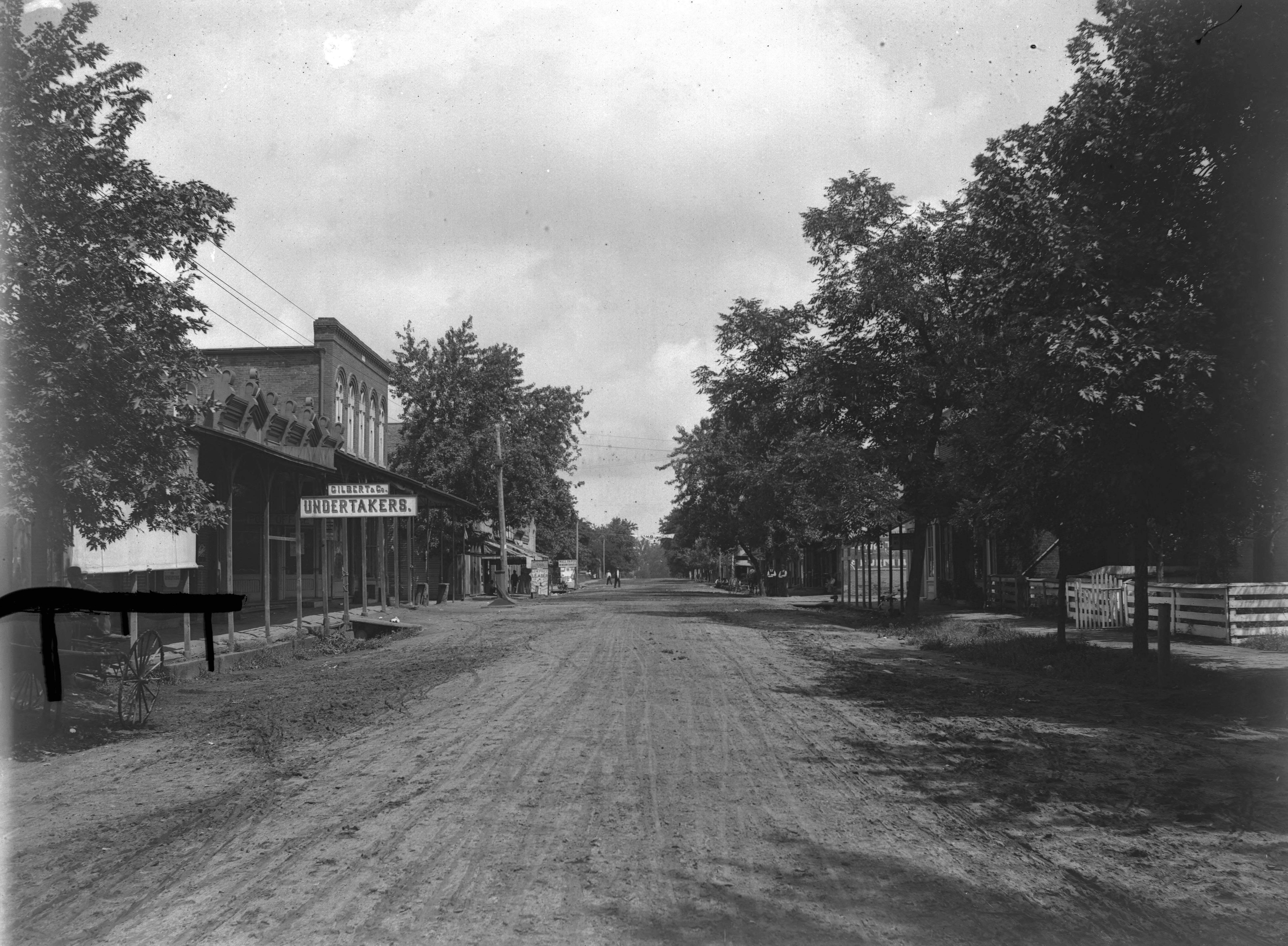 Looking along Main St., with Gilbert & Co. Undertakers on the left. Further down the street on the same side is Miller the druggist and a store selling wallpaper and window shades. There is what might be a barber pole across Main St. from these businesses.