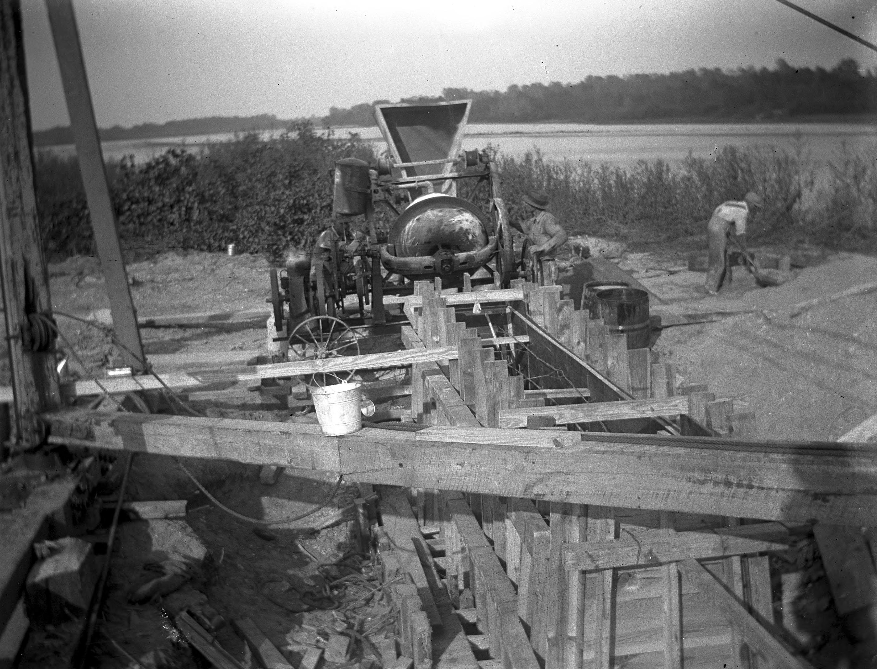 Harmony Way Bridge, Dick Dunn pouring concrete in the new pier on Illinois side of the Wabash River. Until the Harmony Way bridge between Posey County, IN and White County, IL was built in 1930, a ferry would have been the only means of access. This bridge is now closed due to being structurally deficient, and lack of funding to effect repairs.