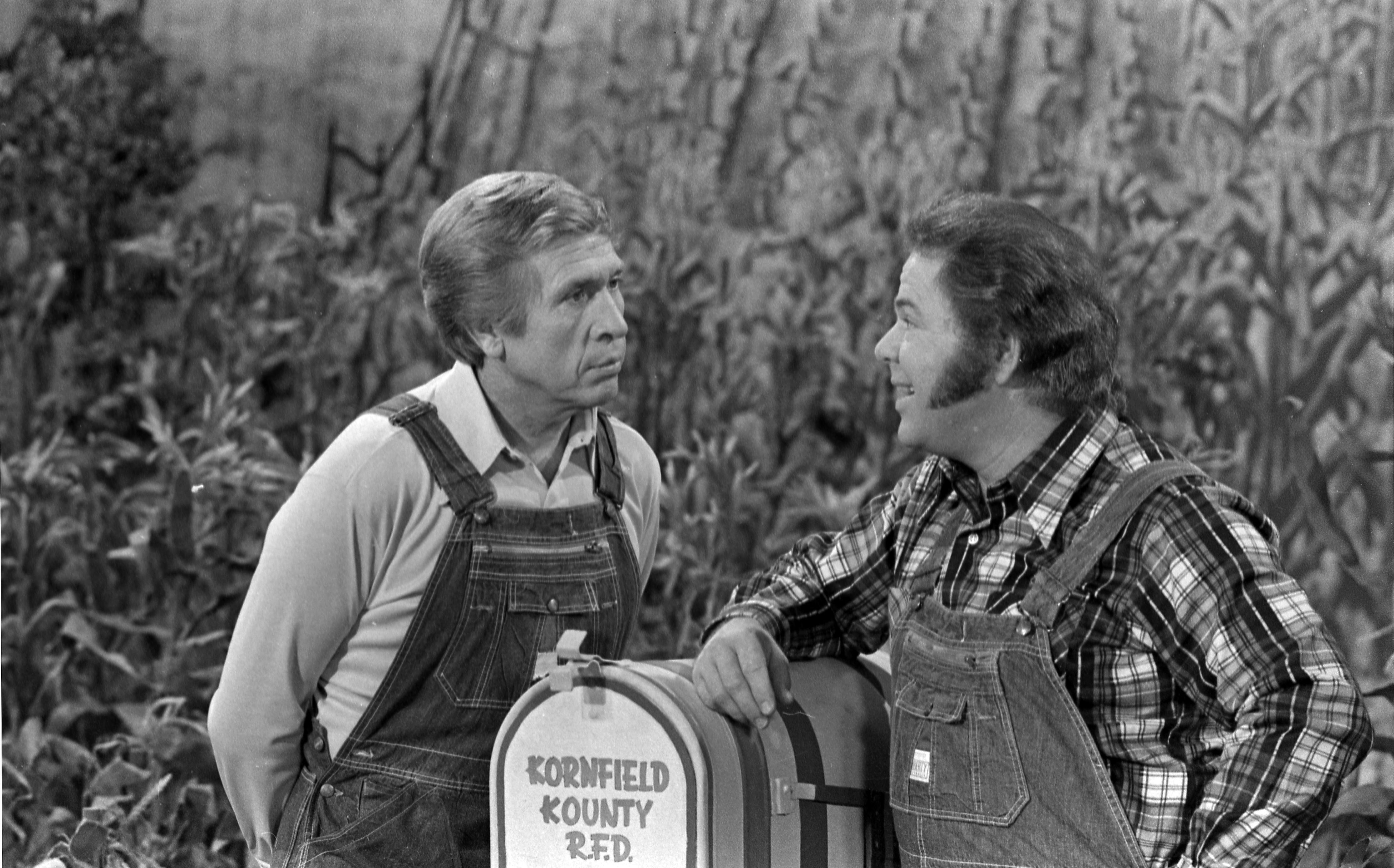 Evansville Courier photographer Sonny Brown was a friend of Hee Haw cast member Grandpa Jones, who was born in Niagara, KY (in Henderson County---just across the river from Evansville, IN) and thus was able to visit the set and take lots of backstage photographs. Here are Buck Owens and Roy Clark, meeting over the Kornfield Kounty R.F.D. mailbox.