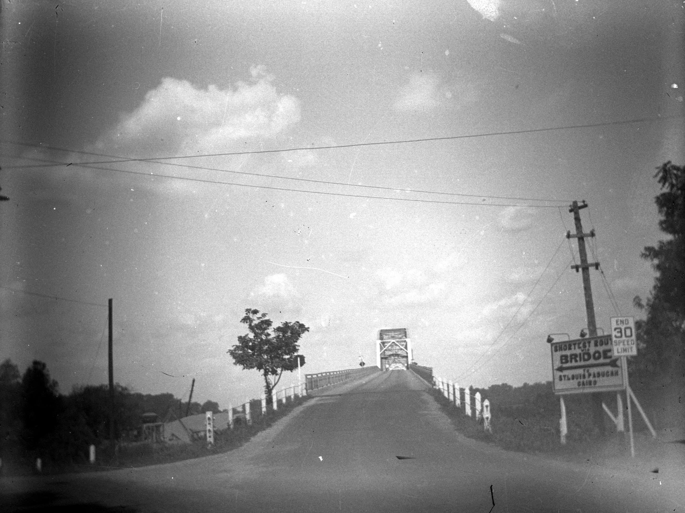 Harmony Way Bridge approach, labeled the shortest route to the bridge which provides access to St. Louis, MO, Paducah, KY, and Cairo, IL. Note how steep the road is. This bridge is now closed due to being structurally deficient, and lack of funding to effect repairs.