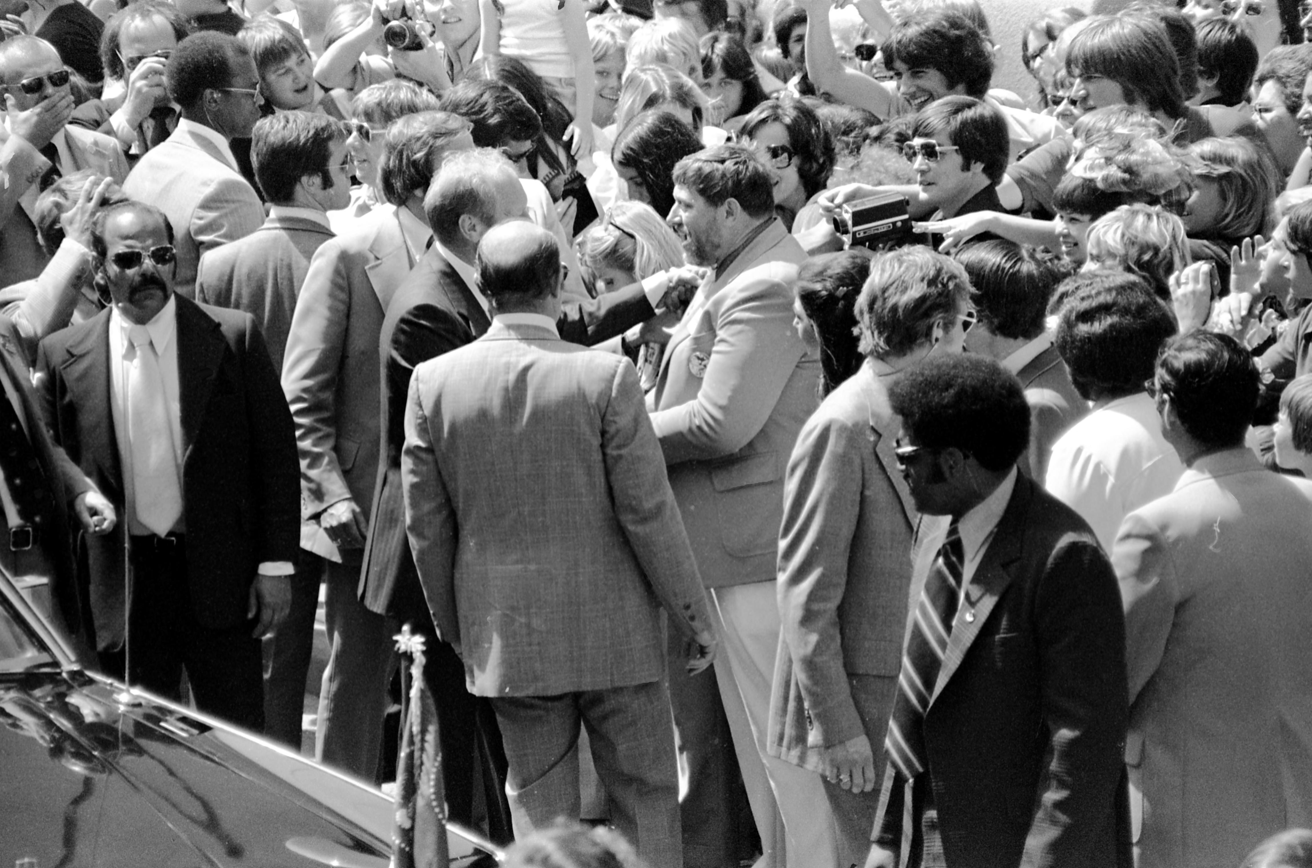 Gerald Ford shaking the hand of a member of the crowd during his U.S. presidential campaign stop