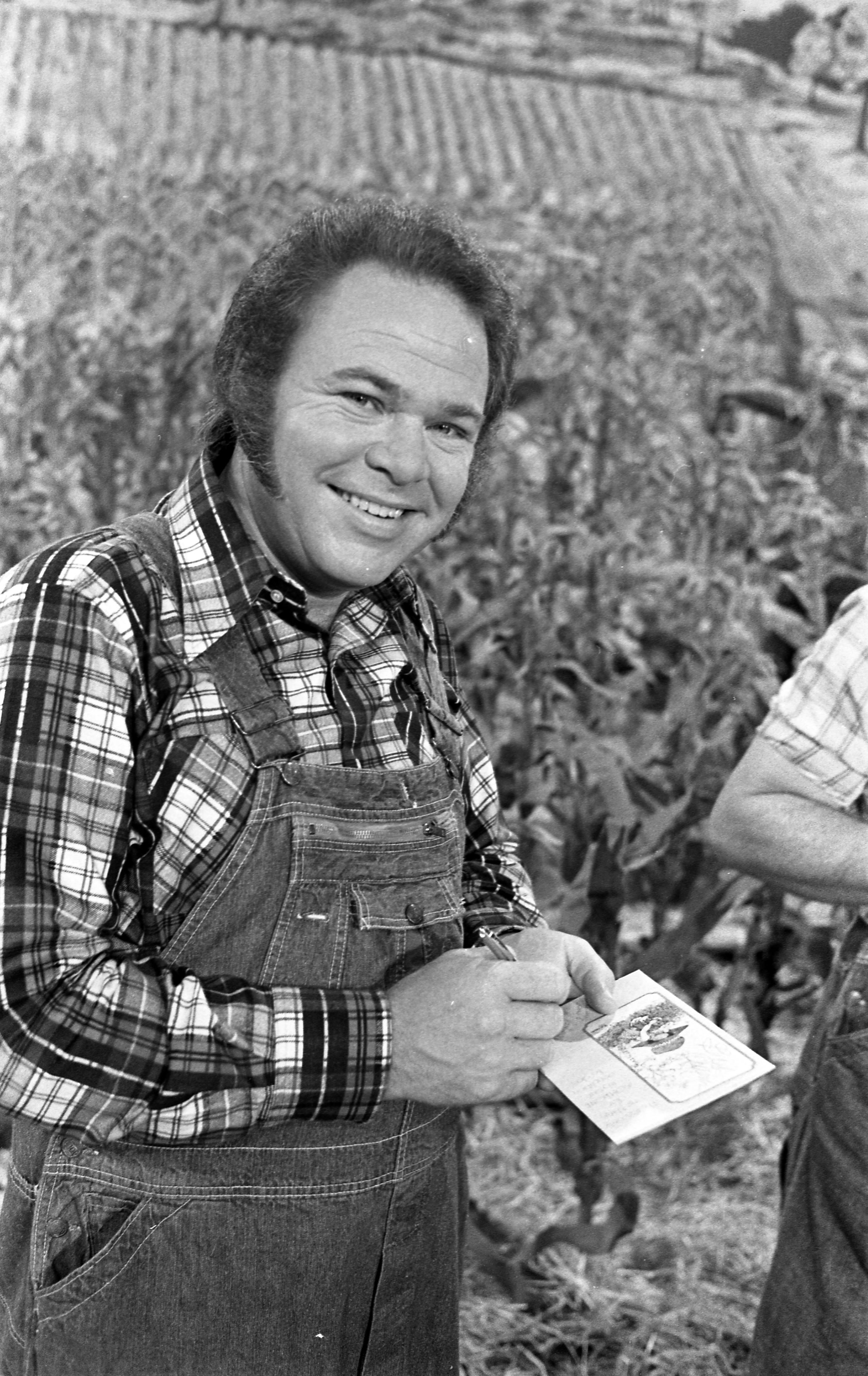 Evansville Courier photographer Sonny Brown was a friend of Hee Haw cast member Grandpa Jones, who was born in Niagara, KY (in Henderson County---just across the river from Evansville, IN) and thus was able to visit the set and take lots of backstage photographs. Here is Roy Clark, apparently signing an autograph.