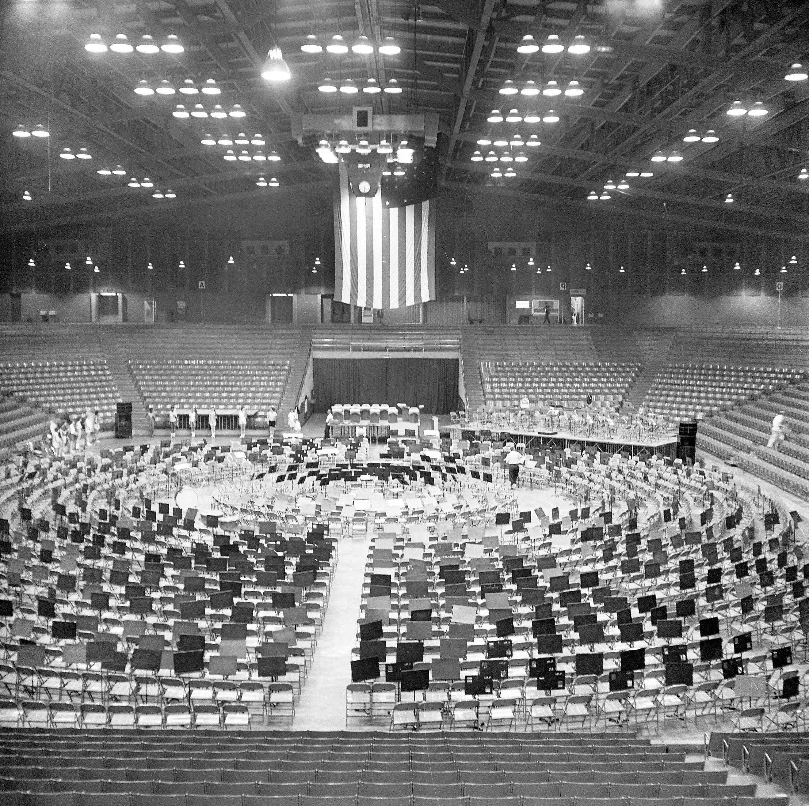 The floor of Roberts Stadium, set up for an orchestral concert. What the event is is unclear, although this is a very large number of chairs. It looks like some of the girls standing below and to the left of the flag are carrying some sort of flags. This facility was razed in 2013.