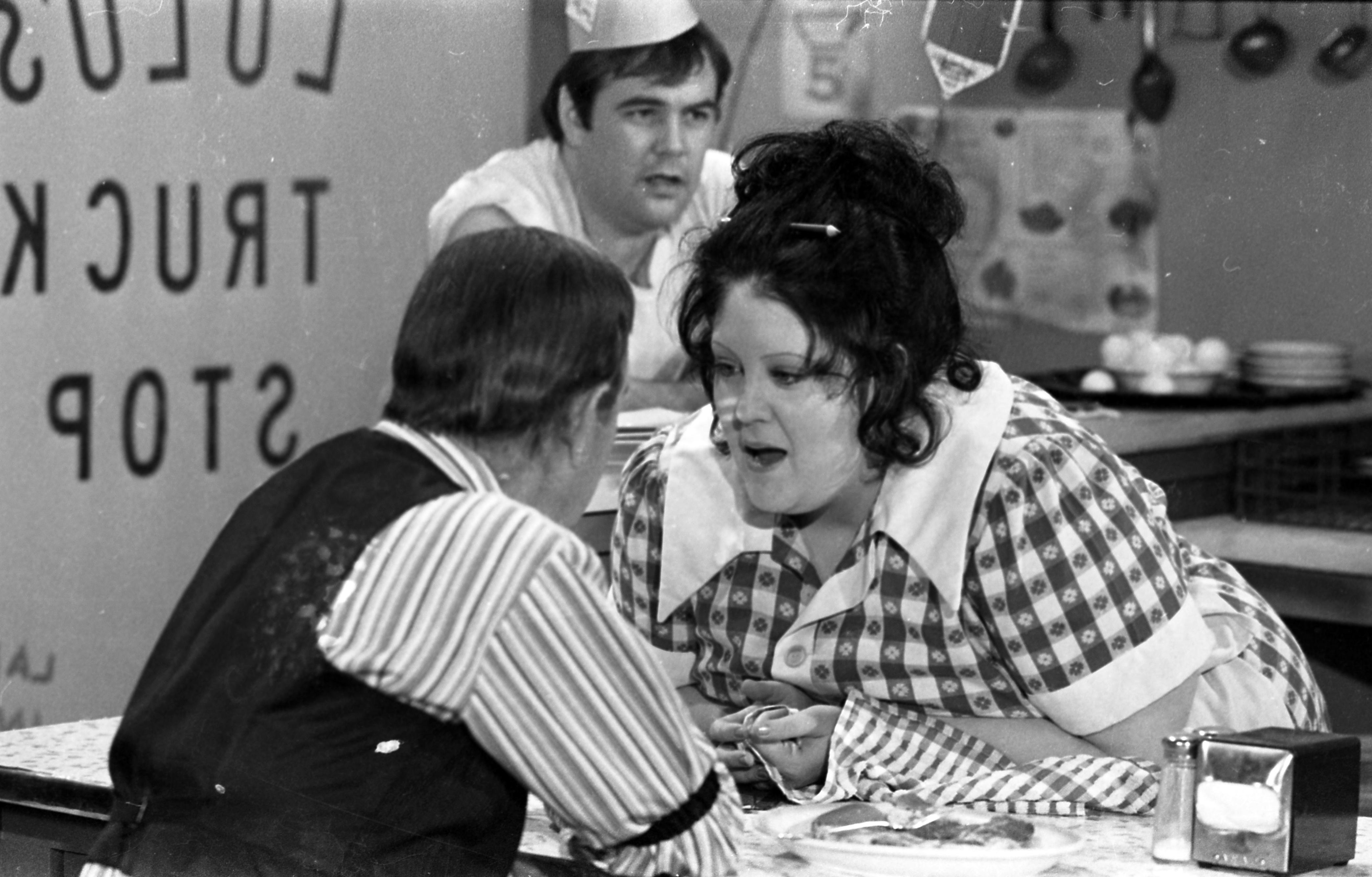 Evansville Courier photographer Sonny Brown was a friend of Hee Haw cast member Grandpa Jones, who was born in Niagara, KY (in Henderson County---just across the river from Evansville, IN) and thus was able to visit the set and take lots of backstage photographs. Here are Lulu Roman, Archie Campbell, and an unknown actor.