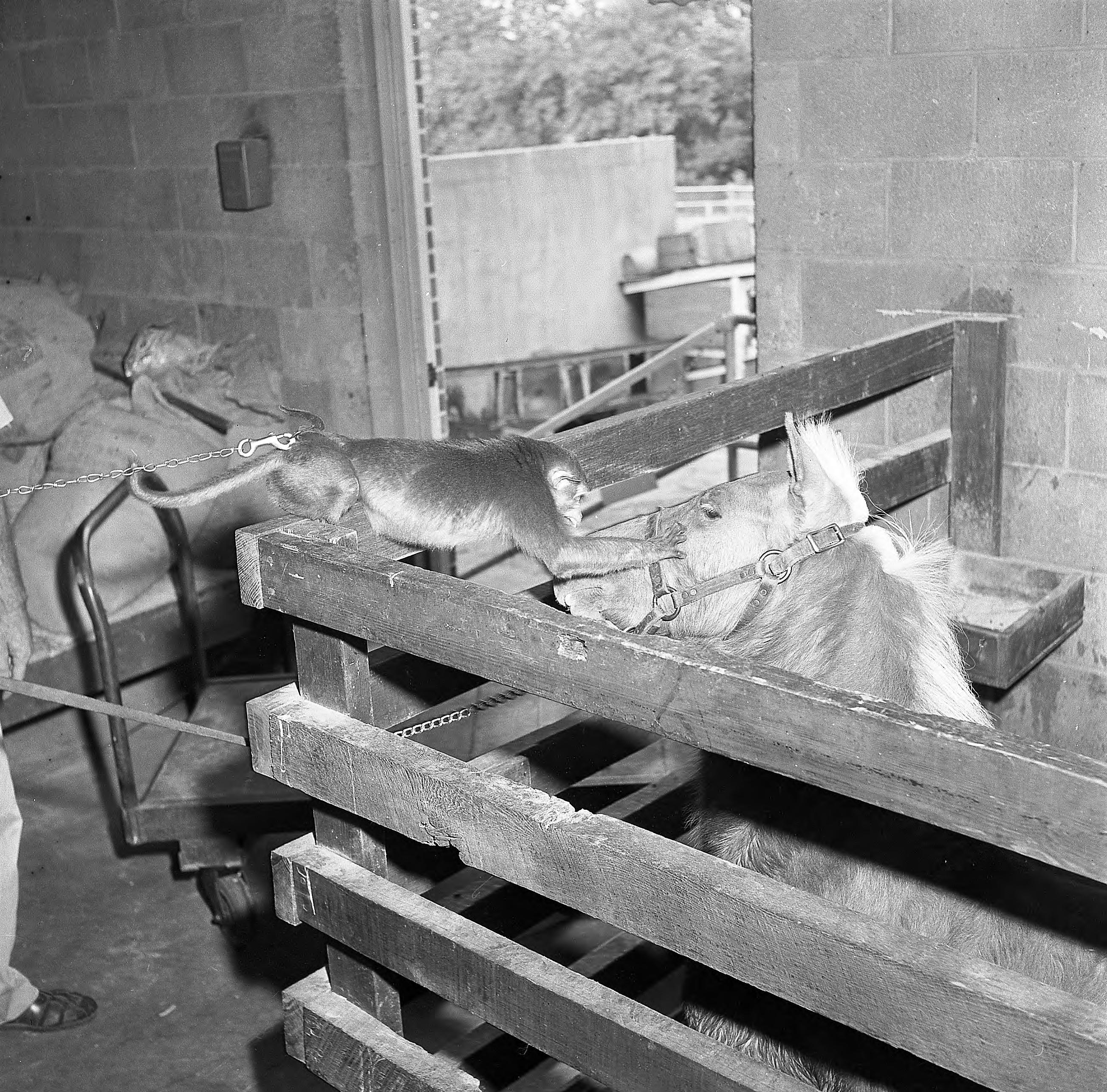 Monkey interacting with miniature horse at Mesker Park Zoo on Bement Ave.
