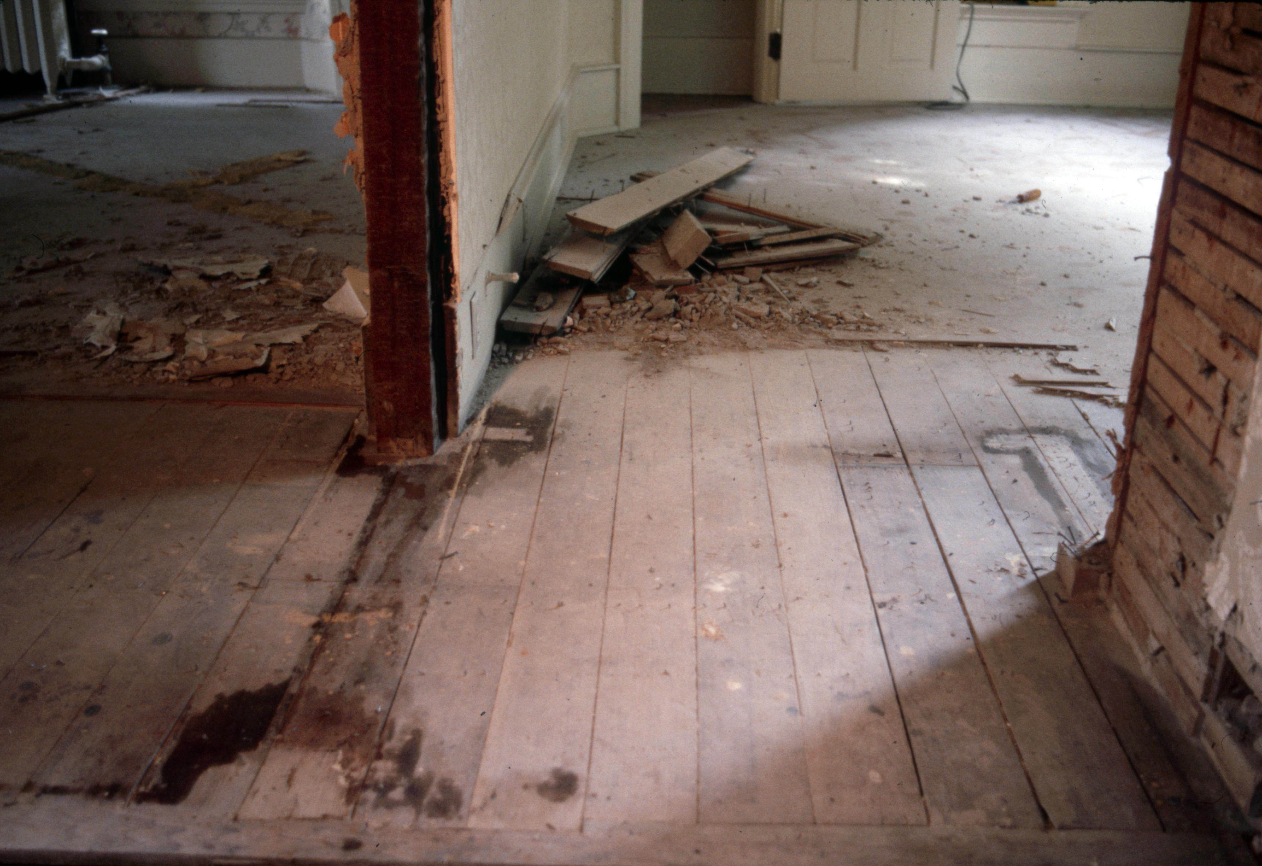 Schnee House: This photo is of the second Schnee home located at 603 West Street and was constructed in 1876. The first Schnee home was constructed during the Rappite occupation of the town, the Schnee brothers having moved to the town from the Quaker colony in Pennsylvania, and that house was located at 517 Tavern Street. The Gypsy Girl Livery Stable was later constructed behind that home. Possible oil stains on the original plank flooring on the second floor of the house.