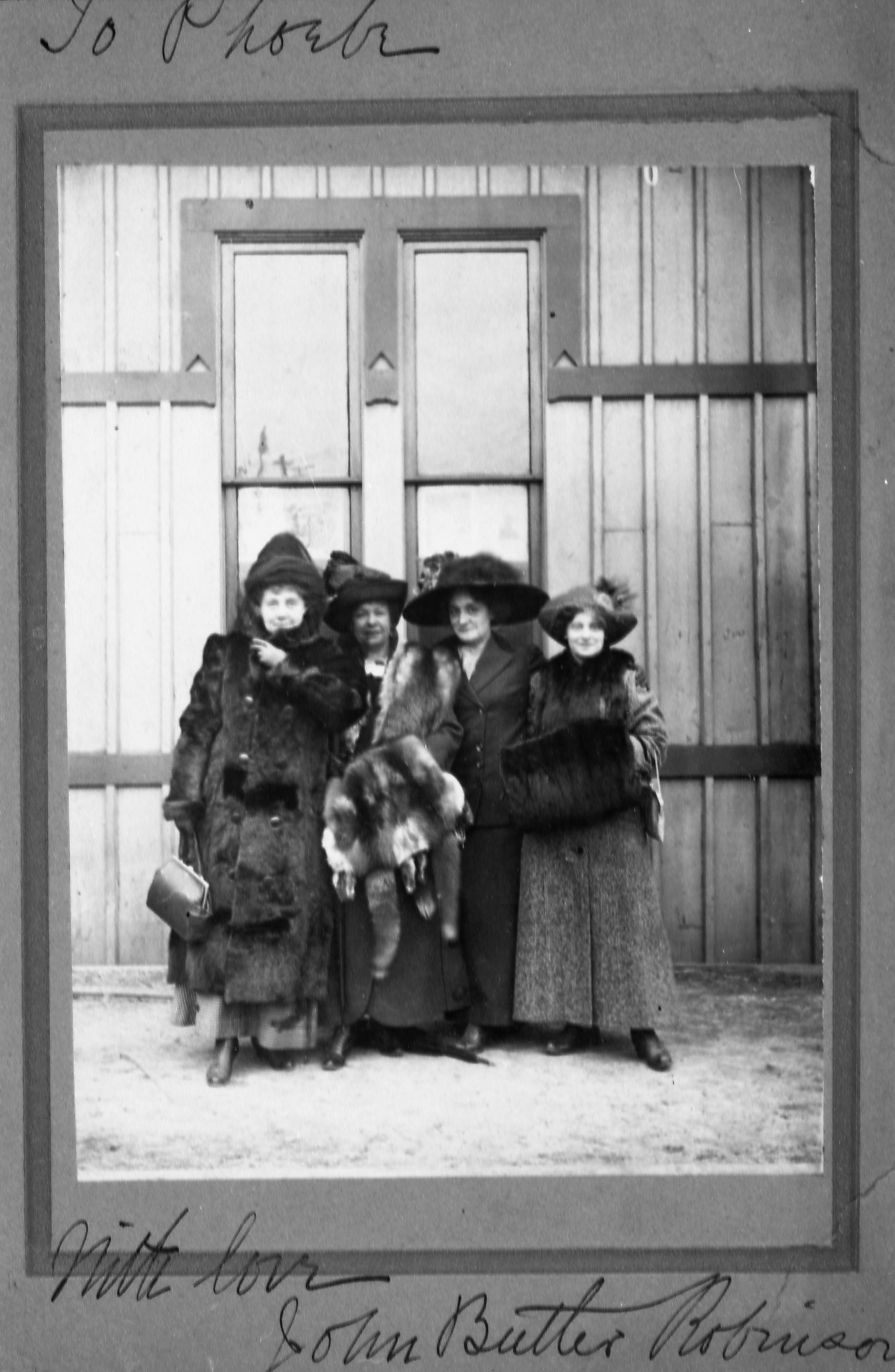Transparencies and Negatives Collection: Historic photographs. This is a photo of four ladies standing on the porch of the Wheatcroft House dressed in coats and furs.
