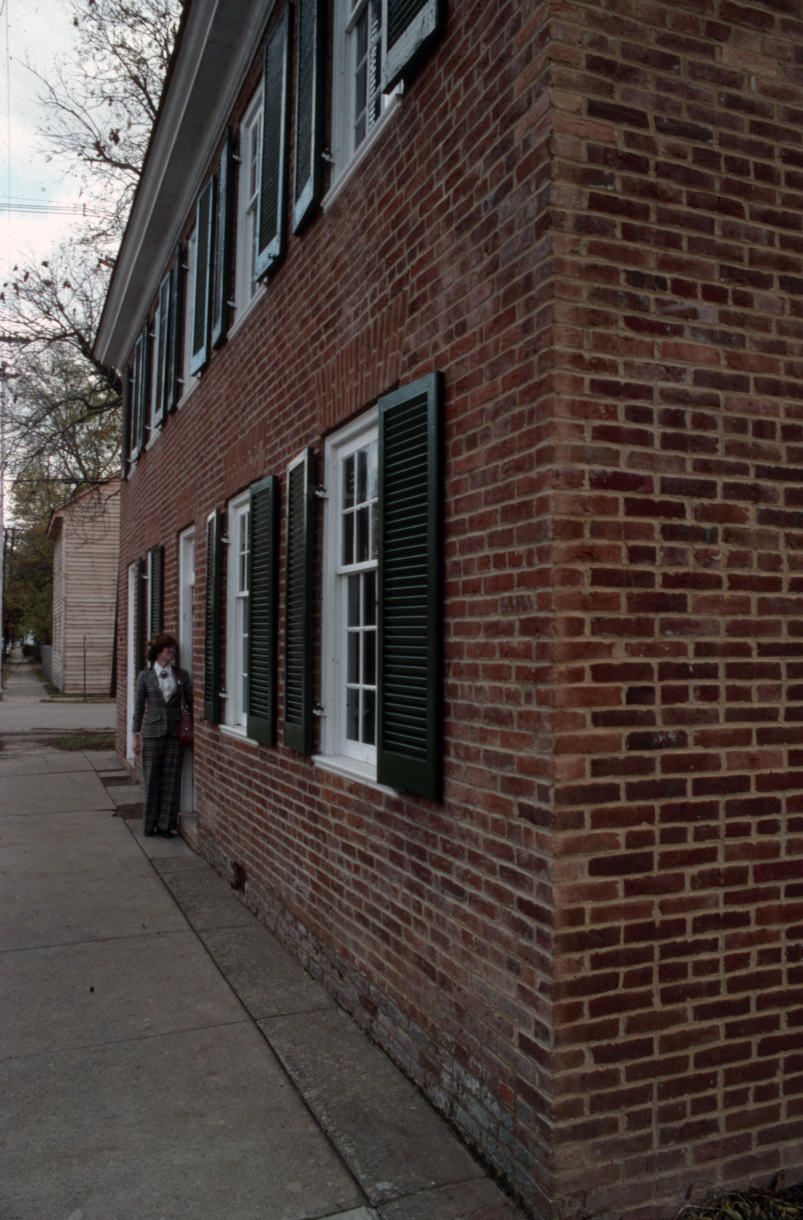 1830 Owen House: Located at 531 Tavern Street. A woman talks in the central doorway of the 1830 Owen House. The photo faces east down tavern street.