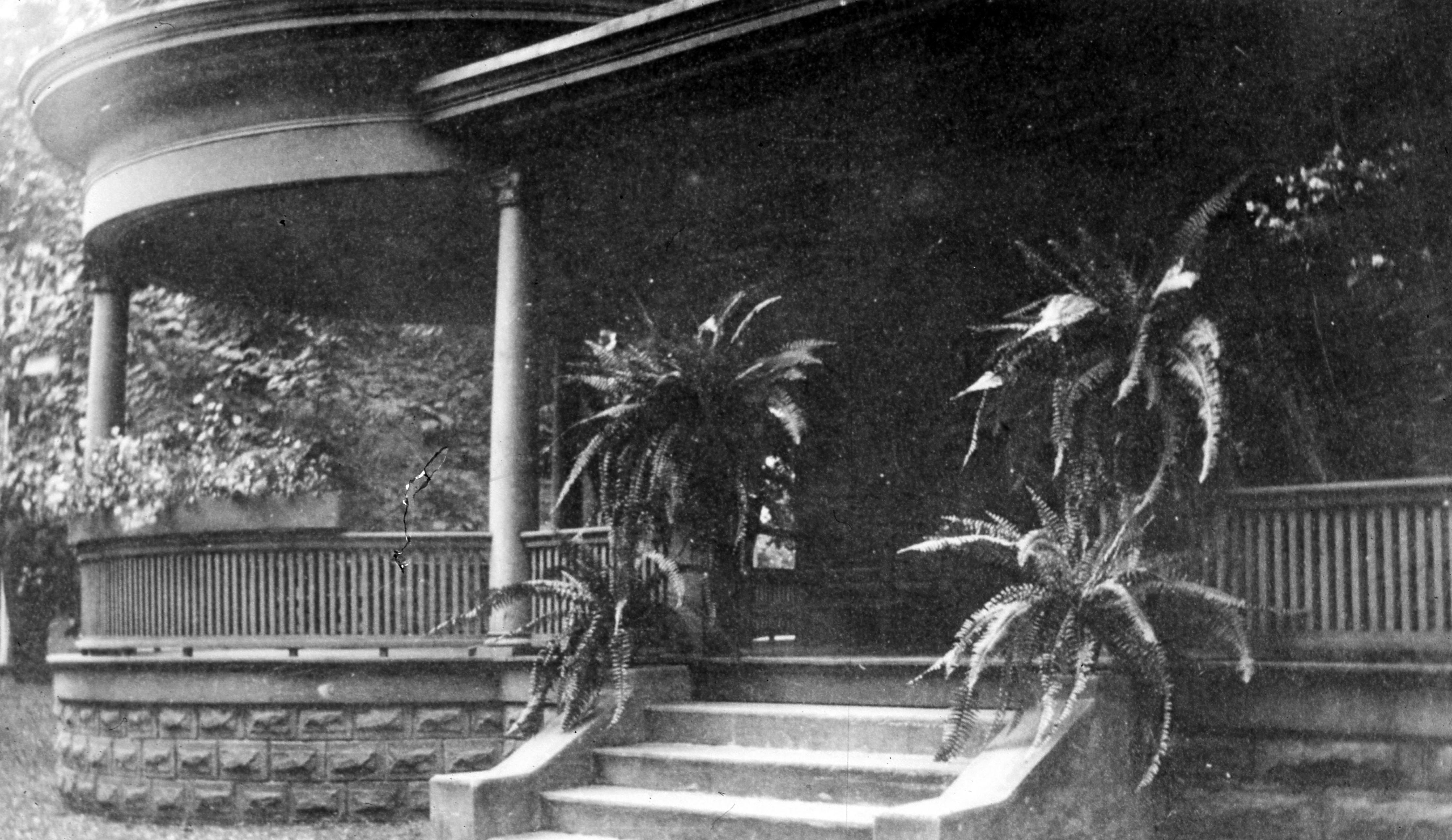 Louis Wade Wilson House: This house is located at 737 E. Church Street. F. J. Schplatter of Evansville, Indiana was the architect of this house. The house was built for Louis Wade Wilson who lived there with his wife Louanna French and their daughter Cecil Pearl (and eventually her husband Edwin Boyer). His father, John Wilson, lived next door just east of his own home at 805 Church Street and his brother, Doctor Thomas Wilson, lived one plat west of his home at 729 Church. Louis Wade Wilson was an insurance agent based in the town. This photo is a close up view of the front porch of the house, which is now an enclosed area. Note the ferns hanging on the porch.