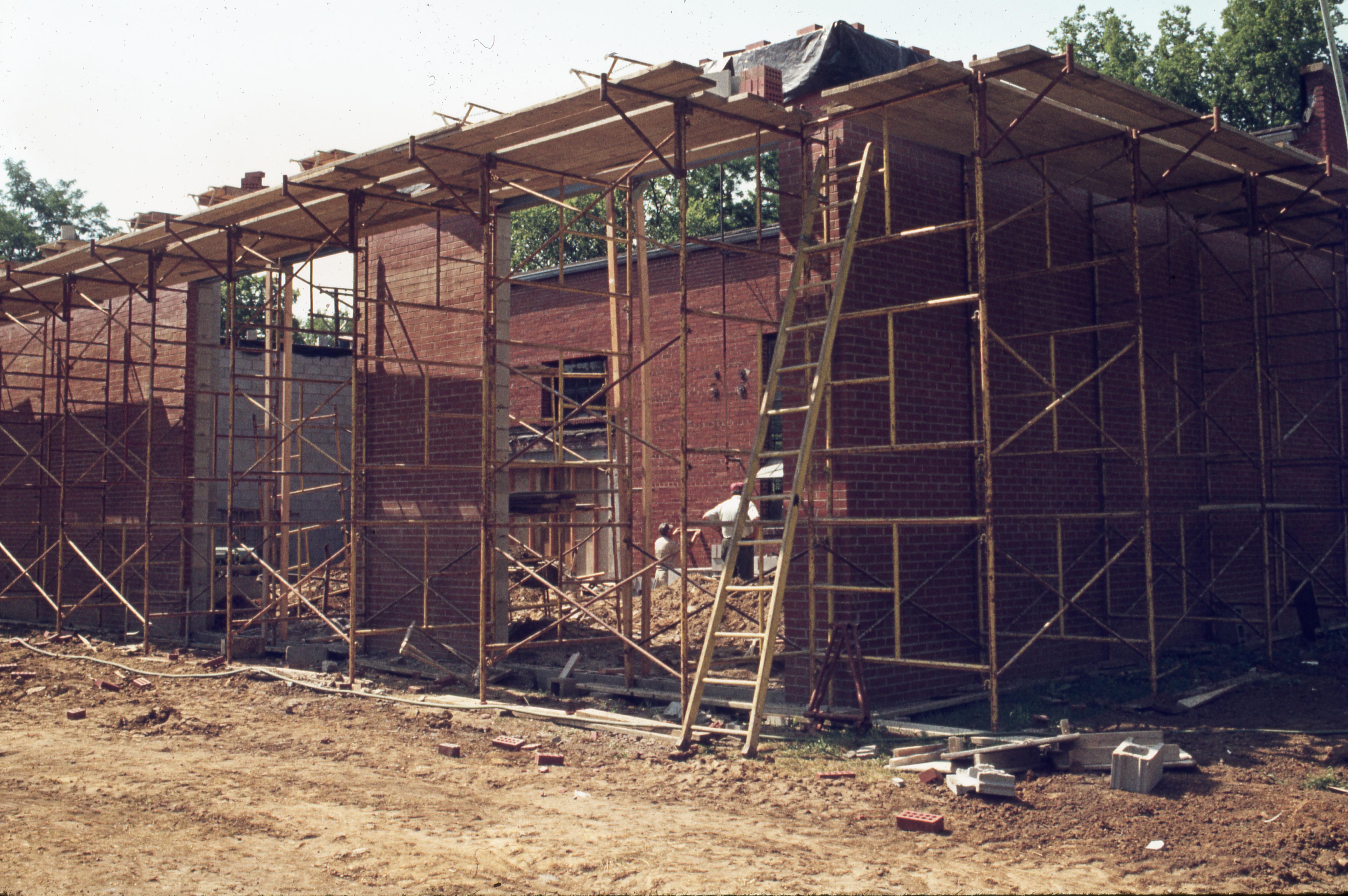 New Harmony Fire House: Located between 707 and 733 Tavern Street. The fire house was constructed on the site of the old New Harmony Electric Light and Power Station and even incorporated parts of the old building into the new construction. The new walls, photo is taken on the southeast corner, behind the old building are nearly finished in this photo. The windows from the old power station can bee seen in the background an one has been modified to accommodate the new construction.