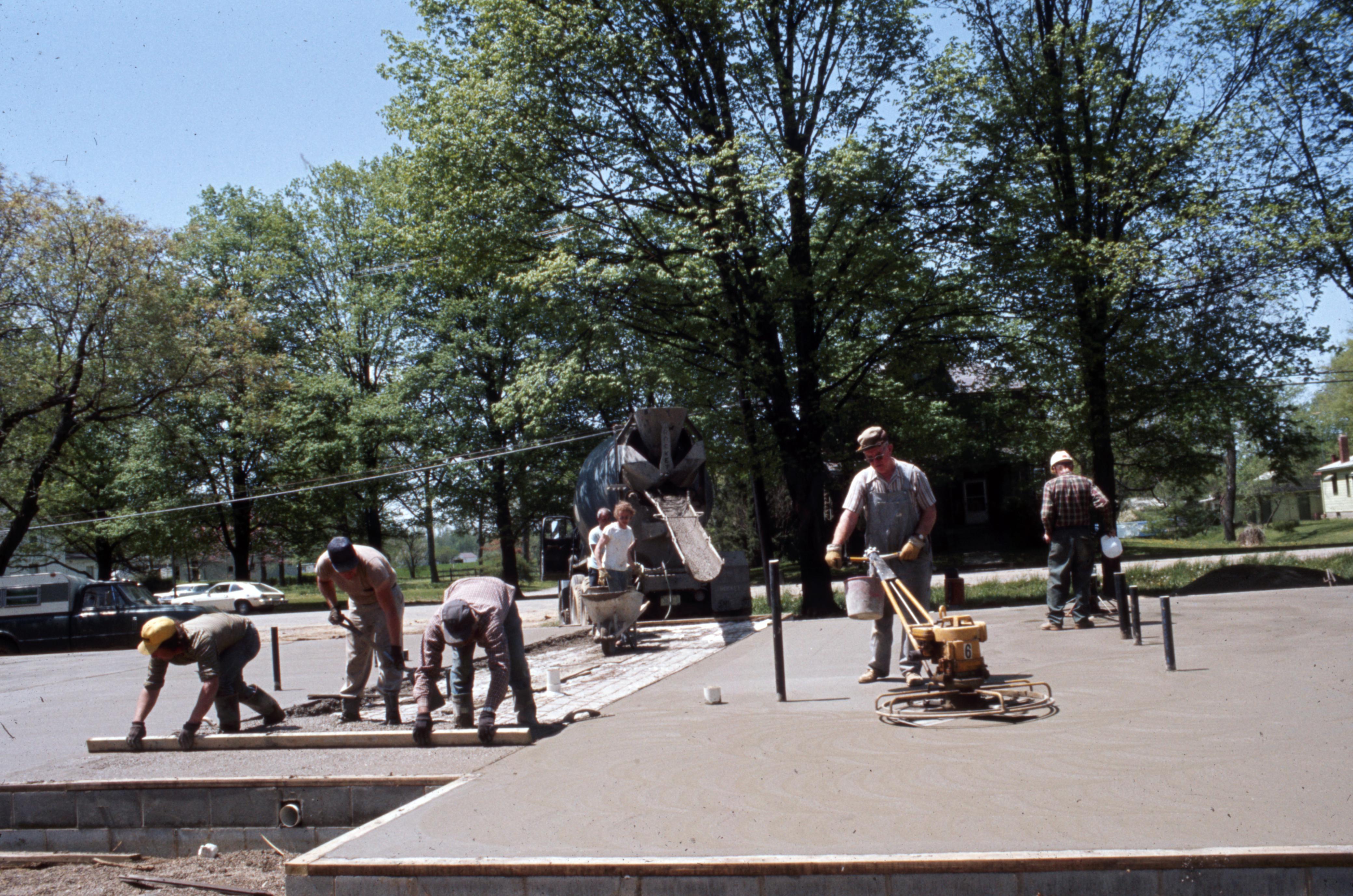 Lanark Development Collection: Buildings which were demolished during the construction of 820 Main Street New Harmony Indiana. Men working on the construction of the new building's foundations. There is a late 1960s pickup truck on the left side of the photo.