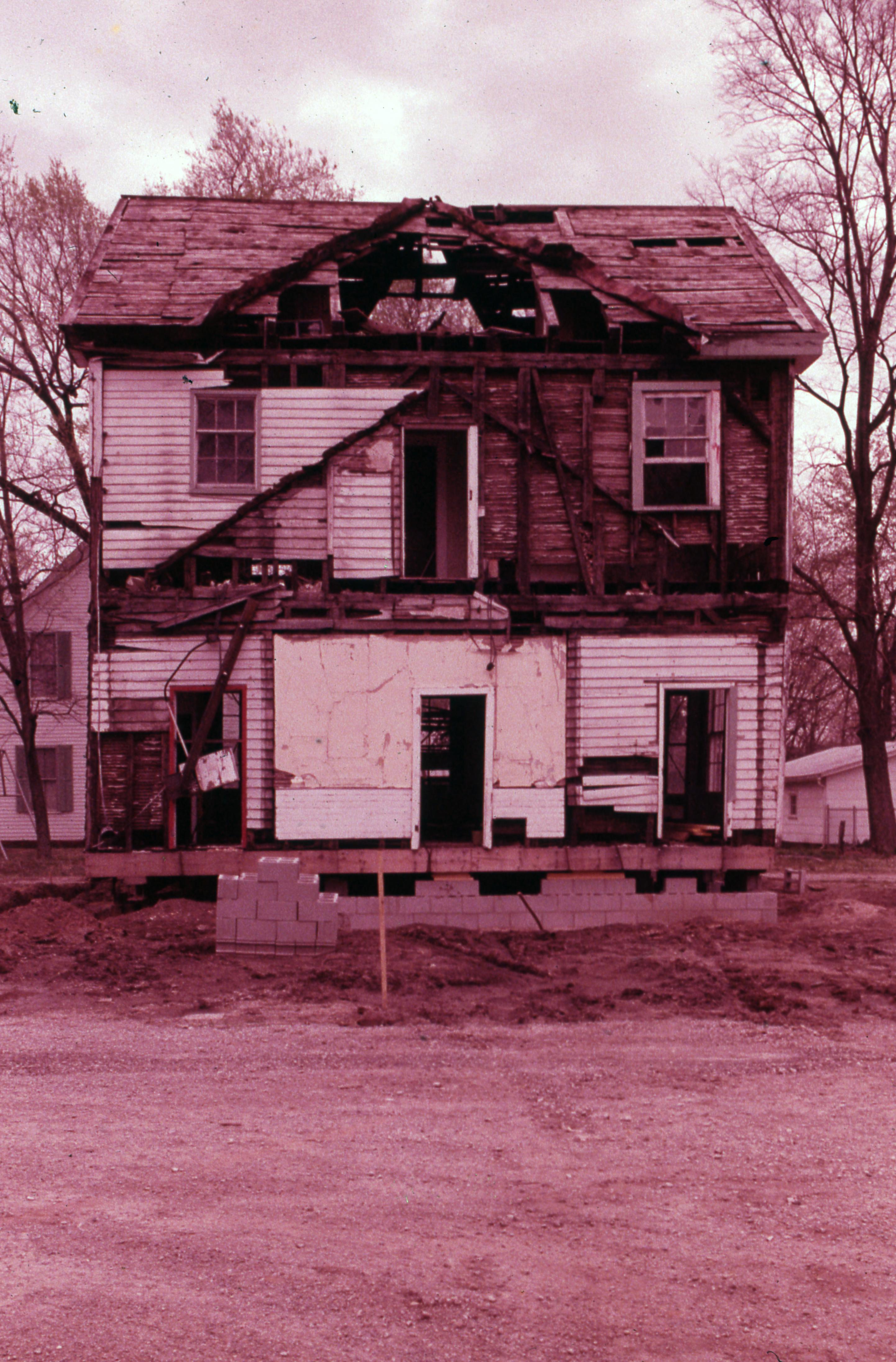 Golden House: This building was moved from the plat of 807 Church, what is now 811 Church Street, to one plat west of 723 E. Church Street but has since been demolished, most likely when the house at 707 E. Church was built in 2009. Elmer Buchta Moving Engineers was contracted for this and many other building moves during the 1970s. This is a photo of the west side of the house, as it was on the new plat location, before remodeling was started. This side faced East Street.