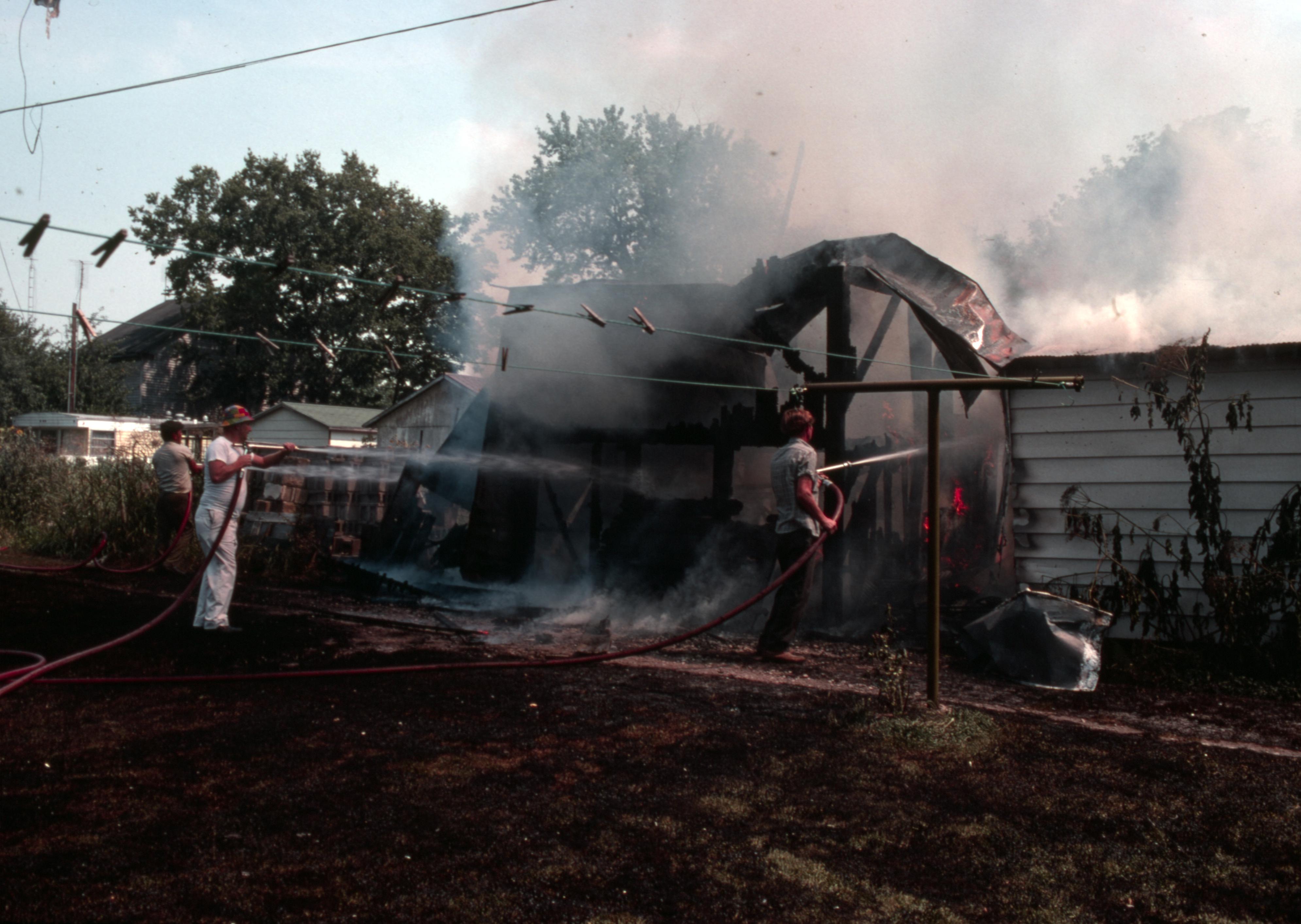 Fredrick Street Constructions Collection: Three men attempting to put out the burning garage located at 608 Fredrick Street.