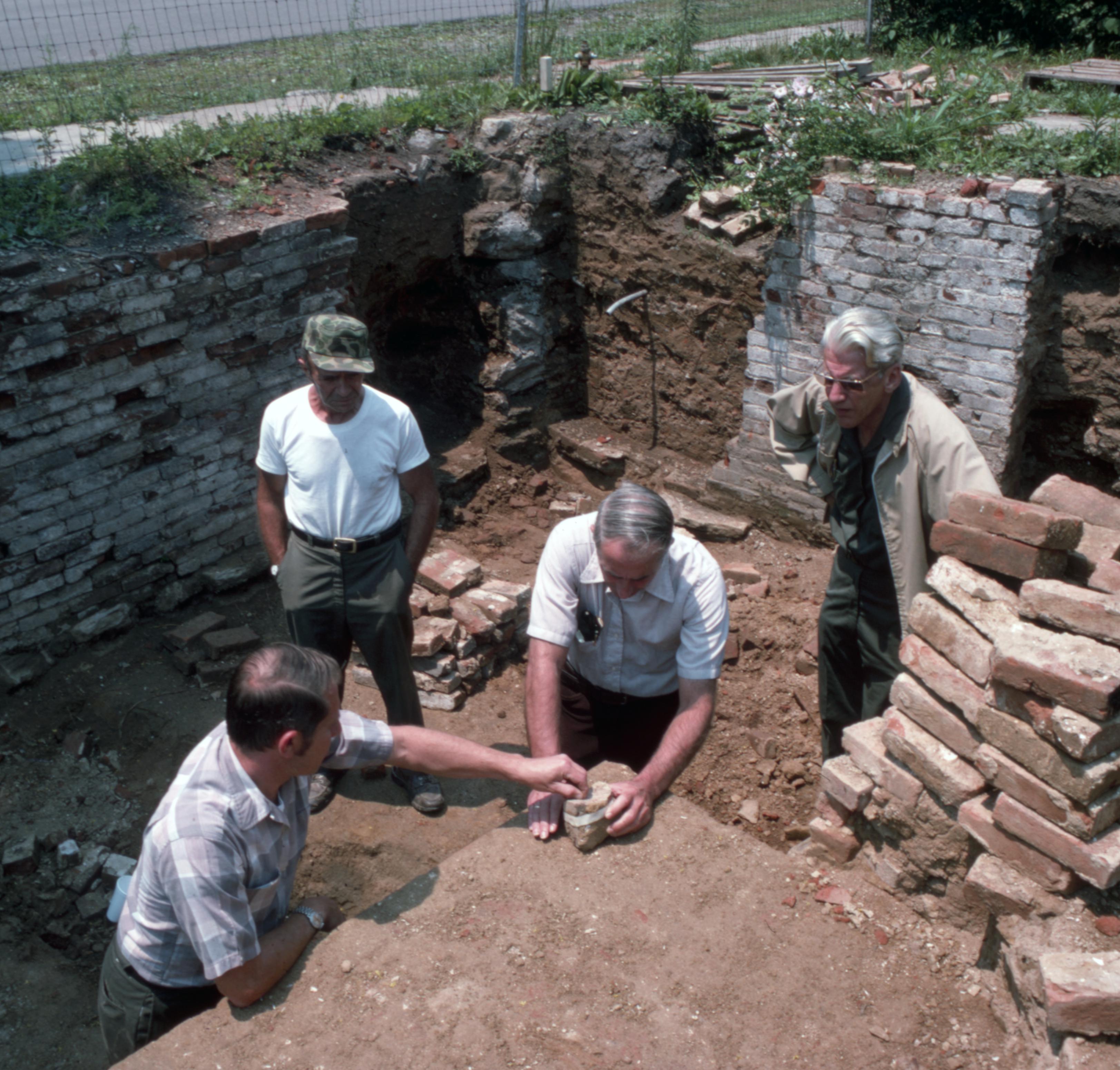 Indiana State University Evansville Archaeological Dig Collection: Russell(Kepler) House. This location was on the bend where Arthur Street merges with North Street. These buildings were moved or demolished to construct the Historic New Harmony Atheneum and parking plat. A group of people working on the dig site.