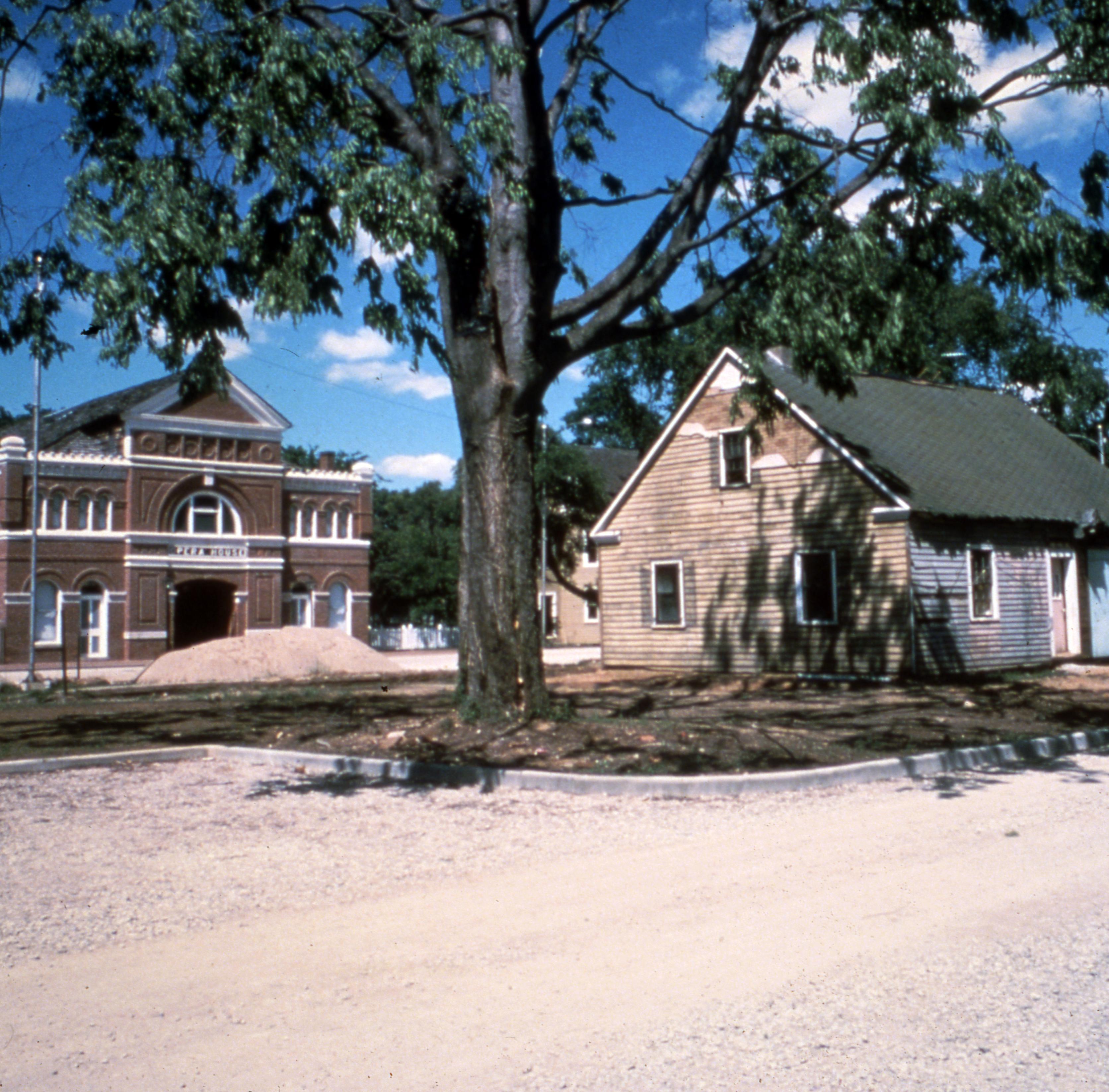 Beal House: The Beal House was moved during the Lanark Construction, on Town Block 8 E/W on Main Street to 611 Church Street. The Beal house was constructed around 1829 by John Beal, who was a carpenter in the Owen and Maclure community. Beal constructed the house from lumber and timbers from an older horse barn. The new location would be the site of the Beal House and 1850s Doctor's Office (The Doctor's Office was a remodel of the Kemmerling House, which was also moved to this site). Elmer Buchta Moving Engineers was contracted for this and many other building moves during the 1970s. This photo shows the house sitting in place but before any of the remodeling had taken place. Across Church Street is Thrall's Opera House.