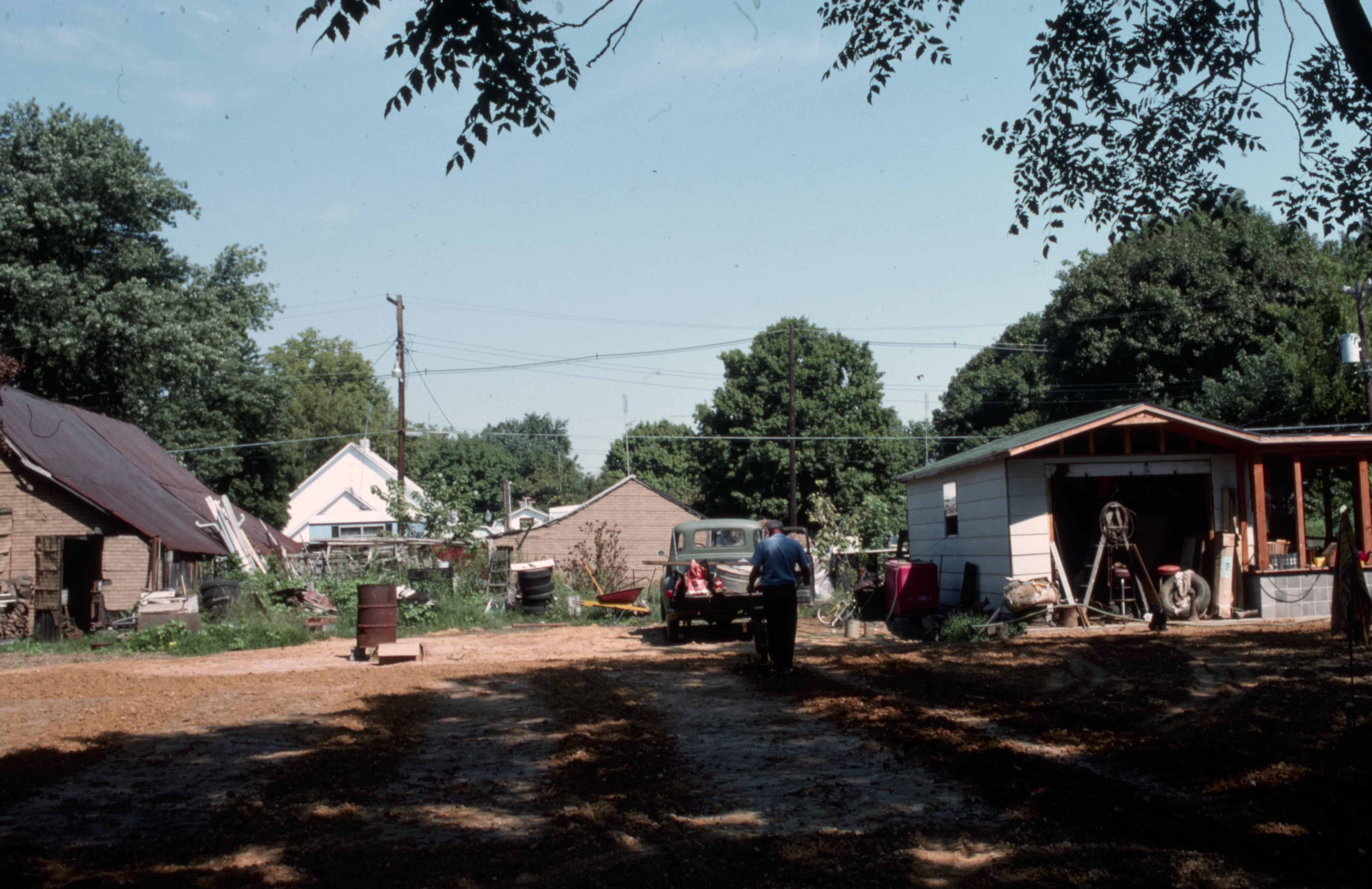 Fredrick Street Constructions Collection: The leveled plat from which the Cooper House was moved from. The brown garage, located at 608 Fredrick Street, on the left side of the photo later caught fire and was completely burned down and demolished.