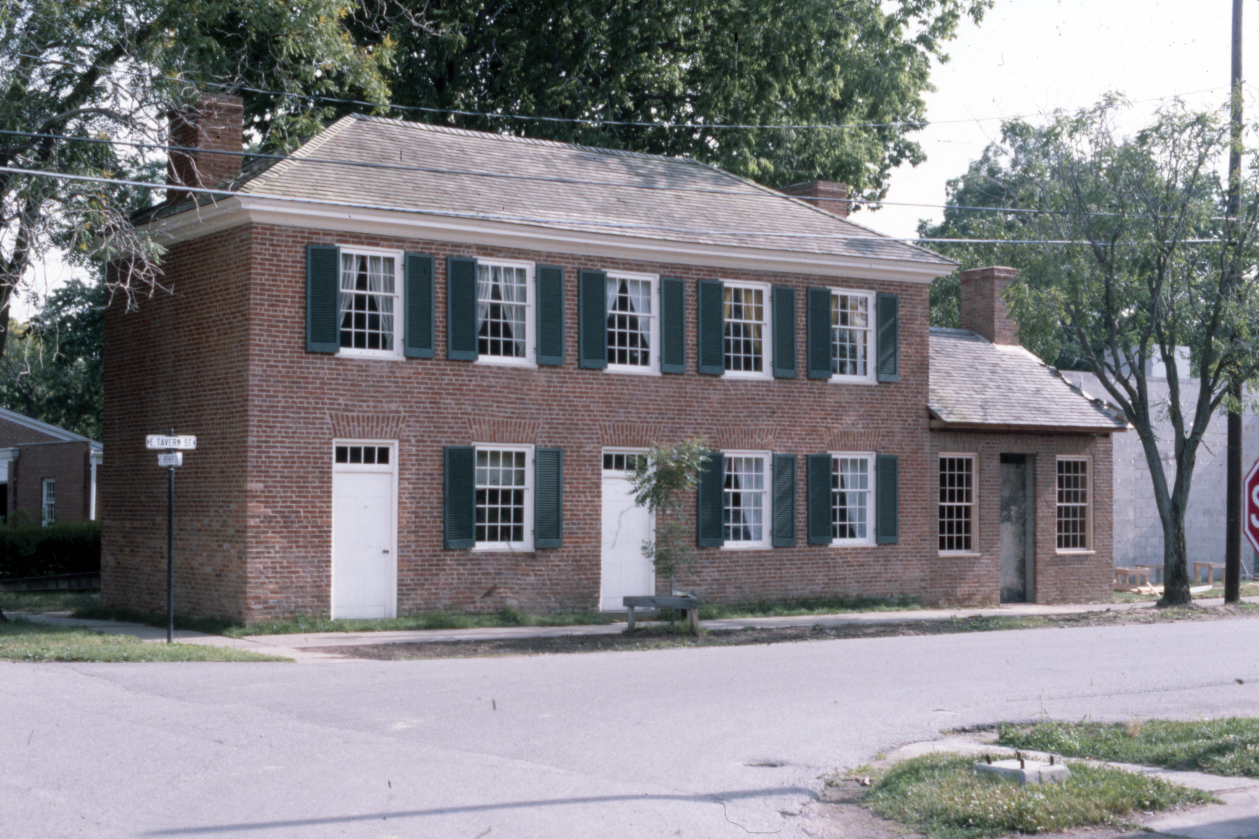 1830 Owen House: Located at 531 Tavern Street. This photo shows the 1830 Owen House west addition as it was under construction. The laundry building, New Harmony Speed Wash, just west of the Owen House, which can be seen on the far right of the photo, is also under construction.