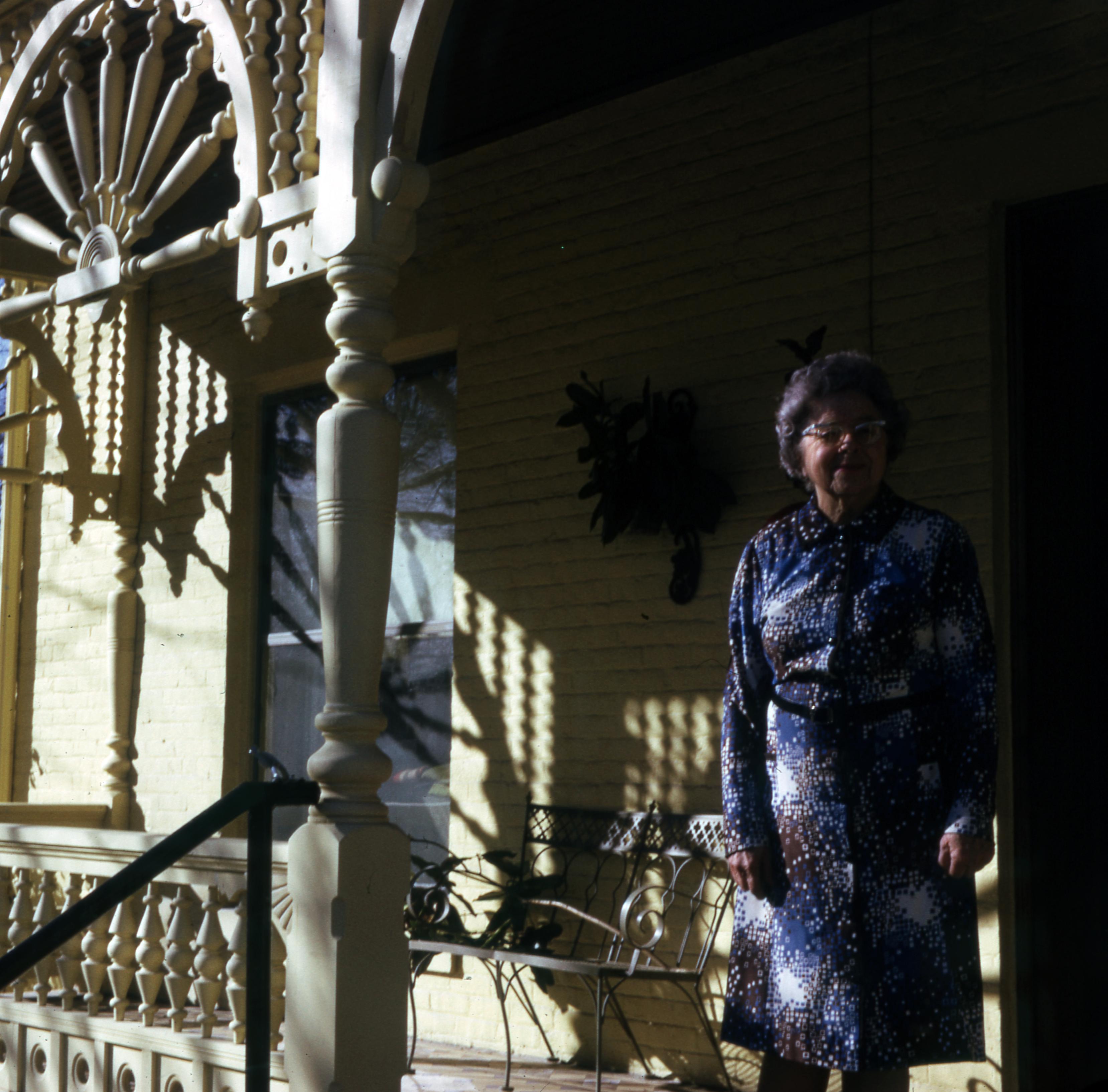 Schnee House: This photo is of the second Schnee home located at 603 West Street and was constructed in 1876. The first Schnee home was constructed during the Rappite occupation of the town, the Schnee brothers having moved to the town from the Quaker colony in Pennsylvania, and that house was located at 517 Tavern Street. The Gypsy Girl Livery Stable was later constructed behind that home. This photo shows the newly completed wooden porch and the decorative corbels that were installed. The elderly lady standing on the porch is most likely the house's owner at the time the photo was taken.
