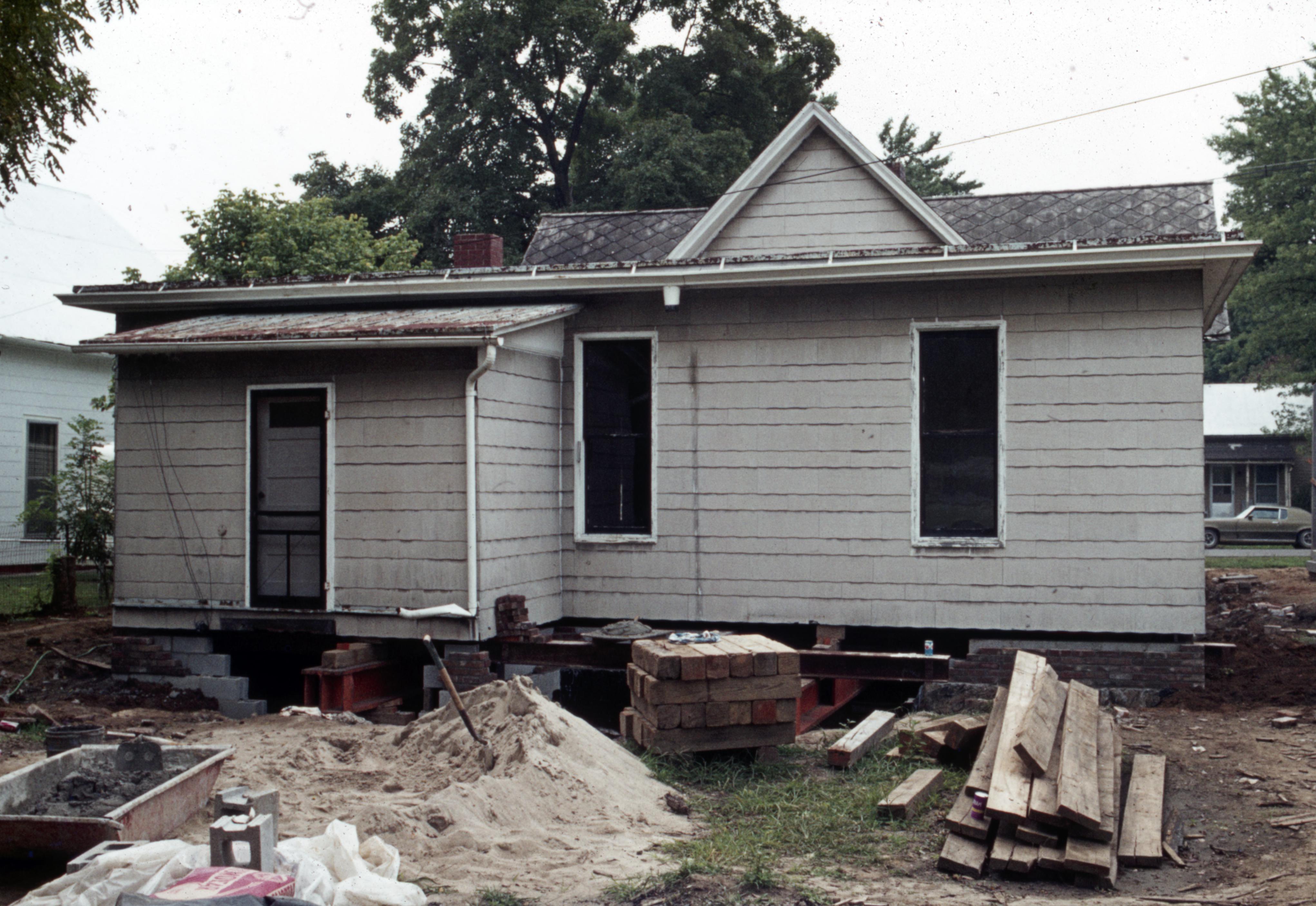 Barrett House Move: This house was originally located at 1826 Main Street but was then moved to 604 South Street during the Lanark Construction. Elmer Buchta were the movers. The house sitting in its final place with the new foundations being built up around it. There is a can of Pepsi-Cola sitting on an I beam next to the house.
