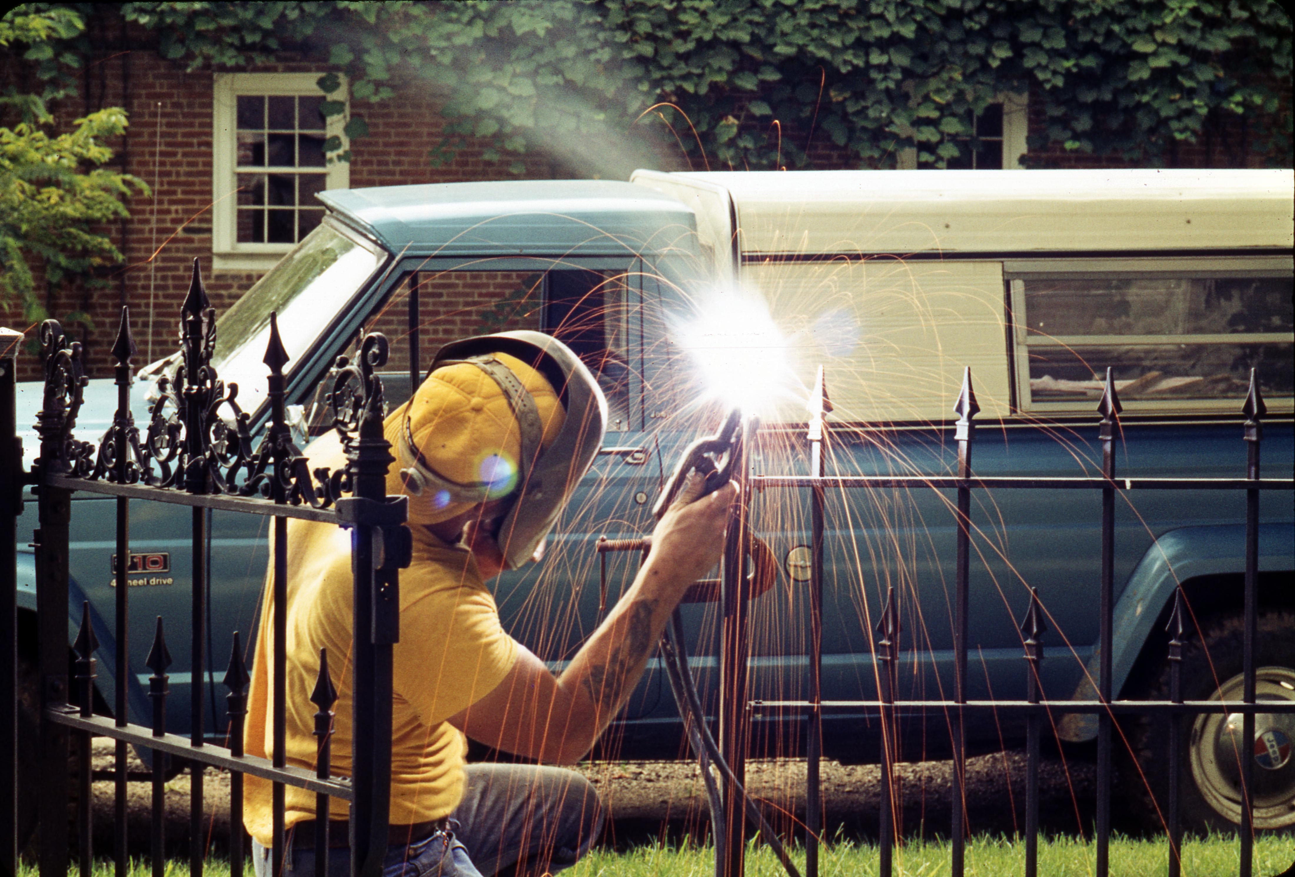 St. Stephen's Episcopal Church: The church was first organized in 1841 and in 1843 the west wing of the old Rappite church was given for use by the Episcopal�s by Alexander and Anne Maclure. At this time the old burial ground was also given to the church, which was bought back by the Rappites in 1846. Then in 1850 the Episcopal�s sold the west wing of the old Rappite Church for $1000 and in 1854 St. Stephen�s Church was constructed, the North Street location where the Lenz House now resides.1888 saw the construction of a new belfry add to the church to accommodate the new bell. In 1911 the new church was built, and an addition was made to it in 1927. The church is still present as of 2022. This is a photo of the iron fence being welded.