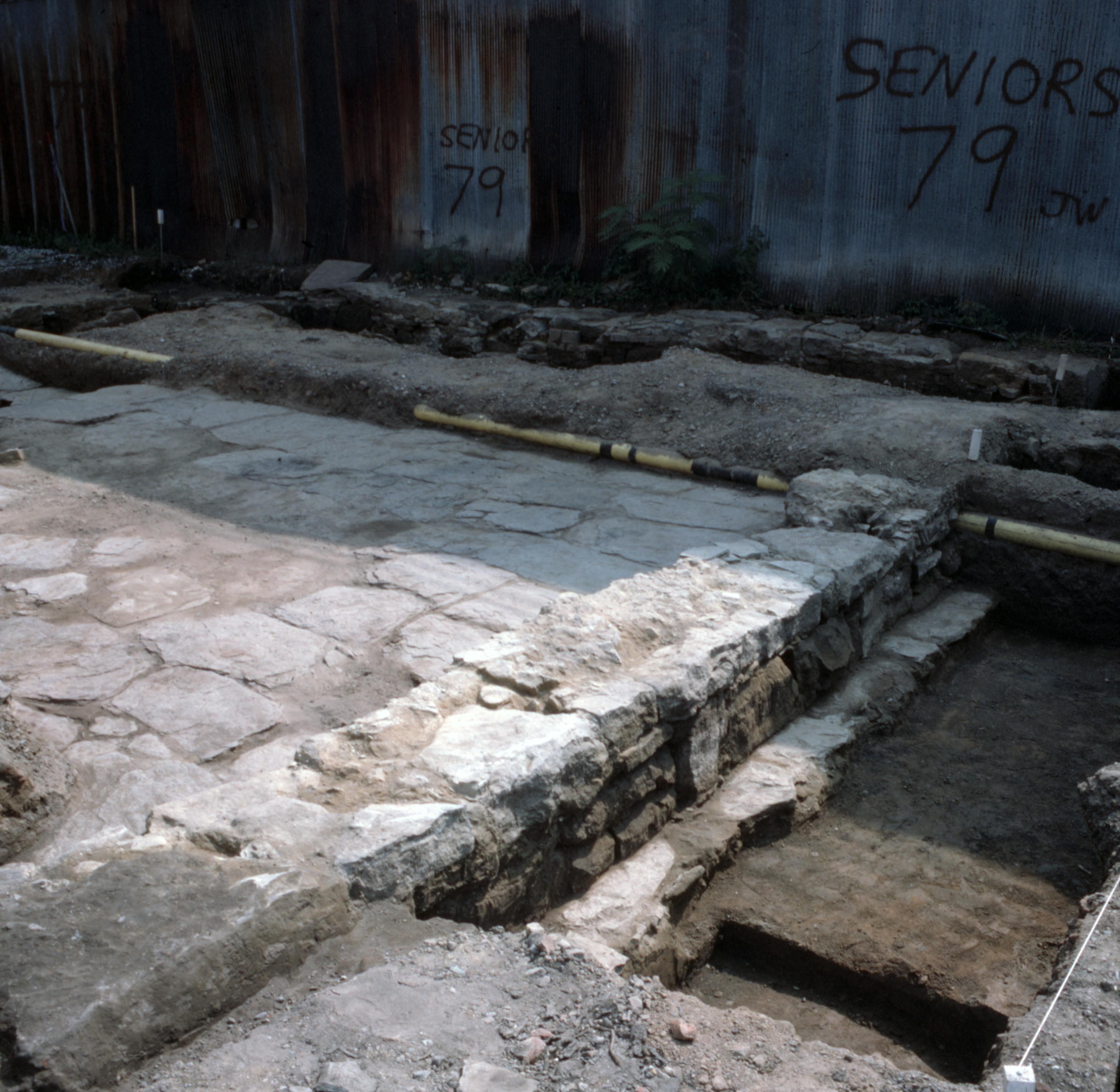Stone Warehouse: The Stone Warehouse was located behind the 602 Main Street building, which is now under a parking plat. This photo shows the archaeological excavation of the Stone Warehouse floor. The old metal building, on the right side of the photo, is located on the site of the old Gypsy Girl Livery stable, but is not present in July 2021.