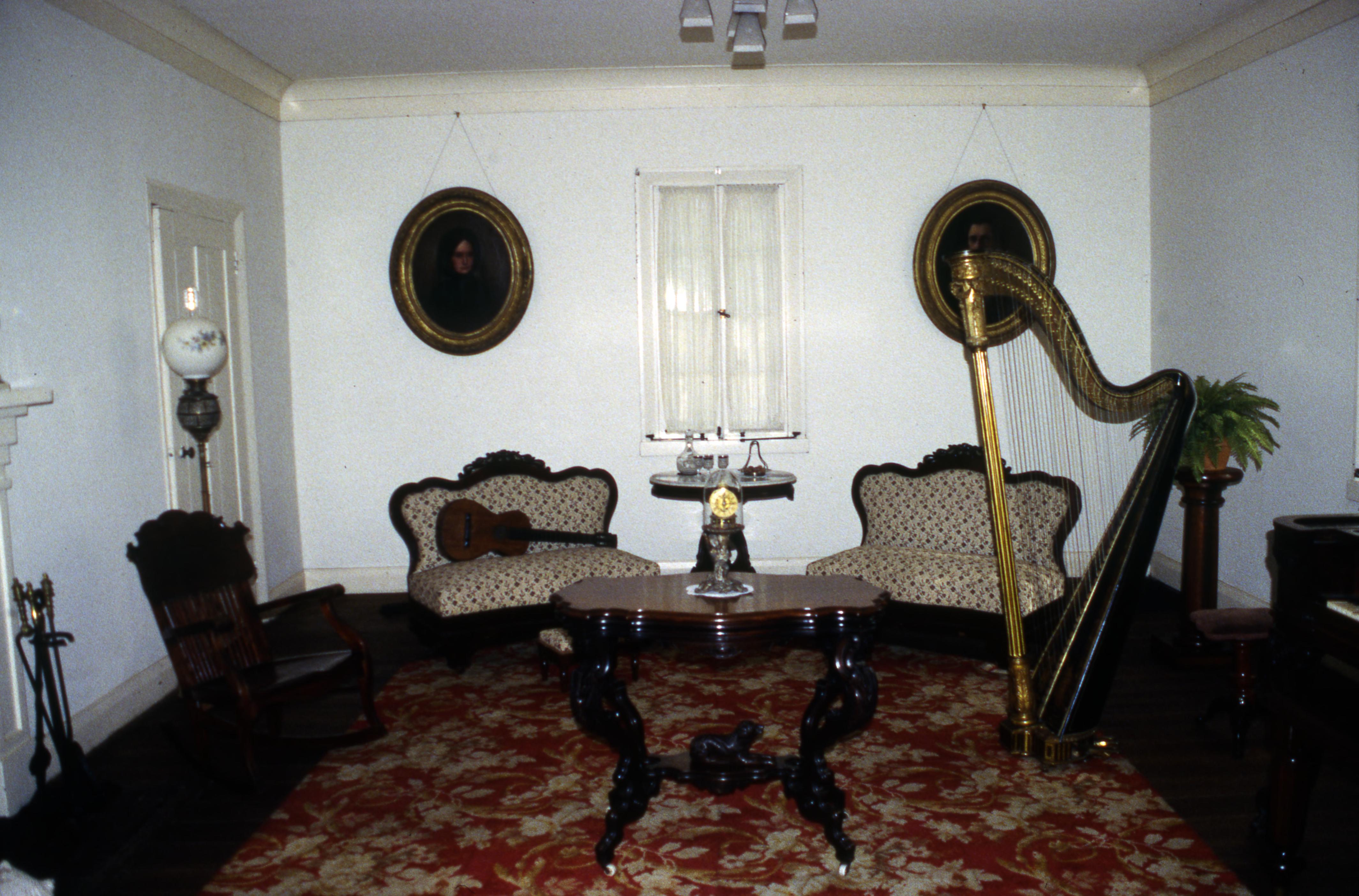 Fauntleroy Family Home Interior, music room showing a piano, Spanish guitar, and harp.