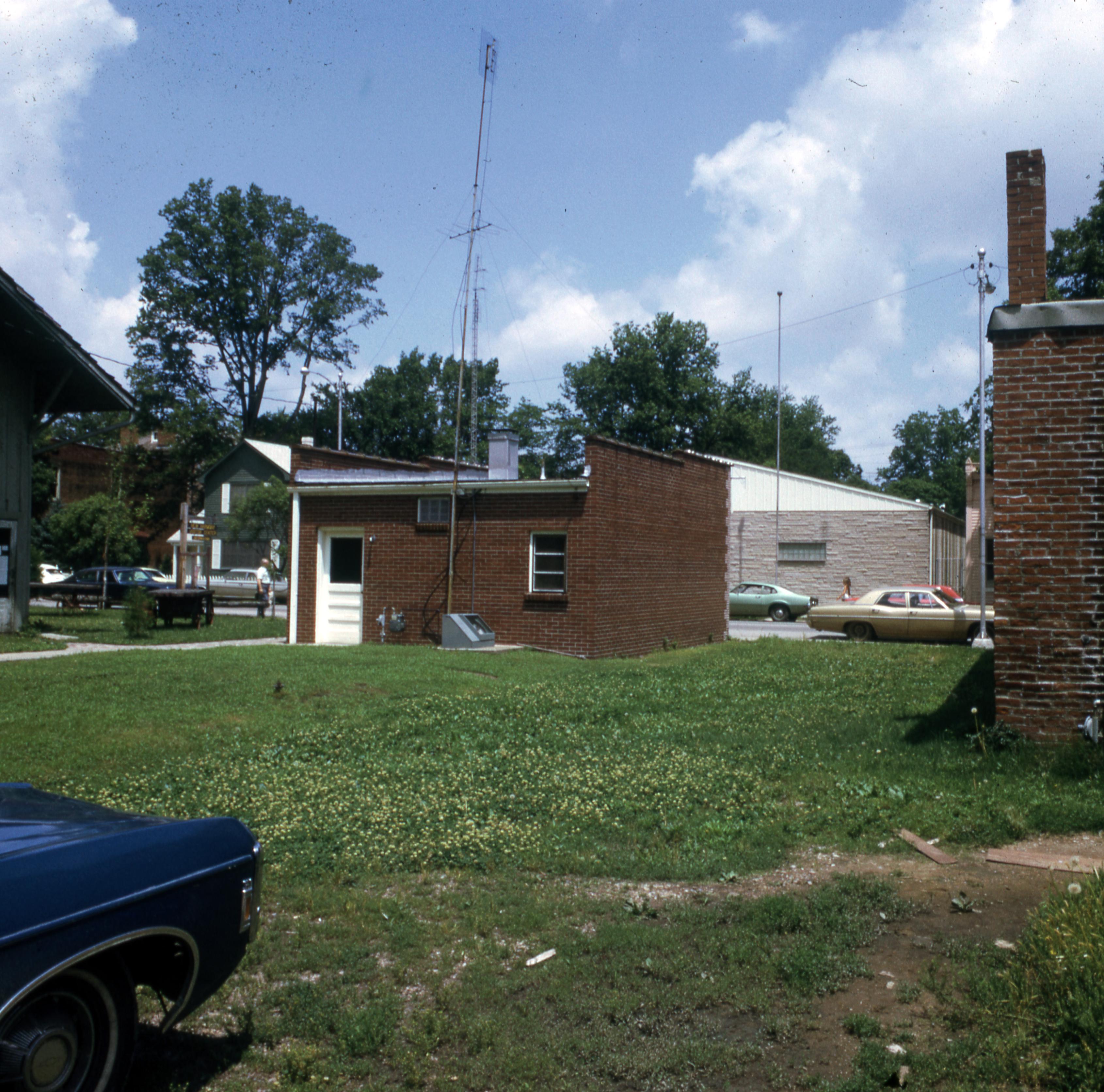 Back plats: This is a photo of the plats behind the buildings on the northwest corner of Town Block 5 E. The photo faces north toward Church Street. The Old New Harmony Train Depot can be seen on the far left side, where it had been moved to from Third Street and was again moved to 801 North Street. This plat was also the site of the Old Community House Dorm #3, which was converted to a hotel after Owen and Maclure purchased the town in 1824. This building was still listed on the 1943 updated Sanborn Fire Insurance Map, although it was listed as being vacant. The American Legion Post #370 can be seen across Church Street.