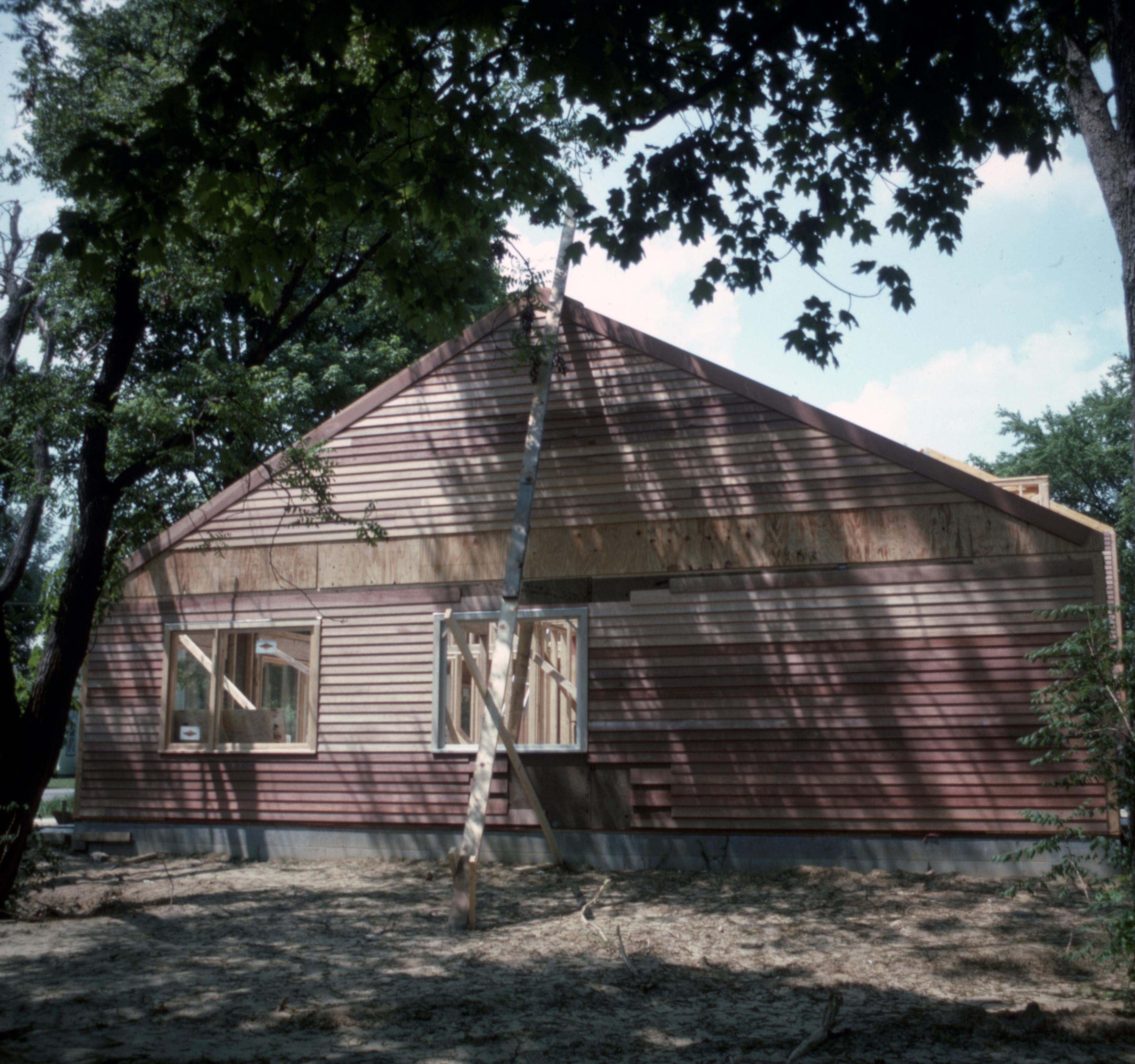 Lanark Development Collection: Construction of 820 Main Street New Harmony Indiana. Setting of an end truss.