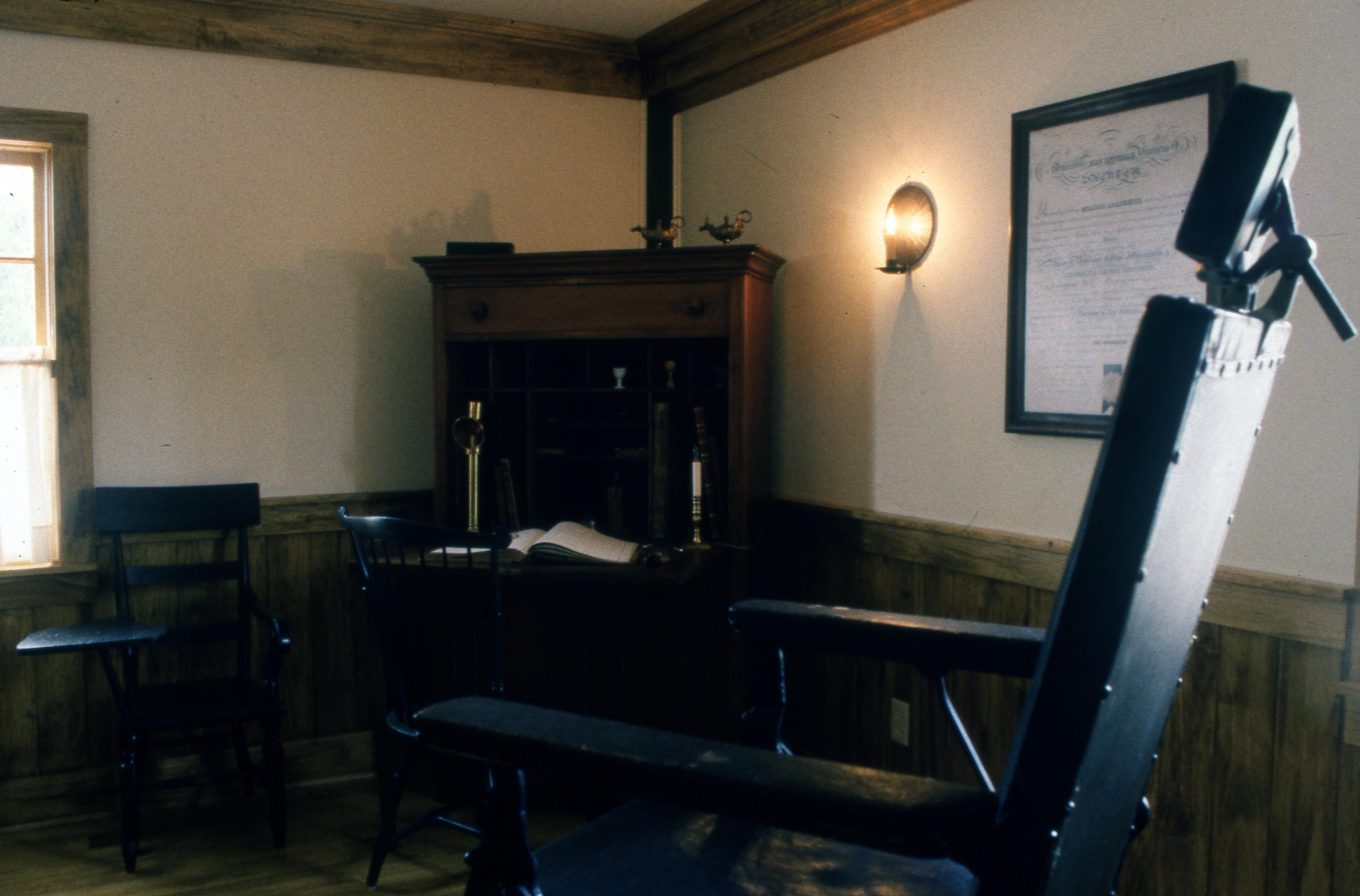 Kemmerling House/1850s Doctor's Office: The Kemmerling House was relocated from town Block 4 J/SE to the new location at 611 Church Street, beside the Beal House. The Kemmerling House was remodeled into the 1850s Doctor's Office, a gift to the town of New Harmony from Mead Johnson. The Kemmerlings were listed in the 1882 Posey County Directory (as Kimmerlin) as being New Harmony Township farmers. Elmer Buchta Moving Engineers was contracted for this and many other building moves during the 1970s. This is a photo of the examination chair which sat in the center of the exam room. The Doctor's desk can be seen in the corner near the center of the photo.