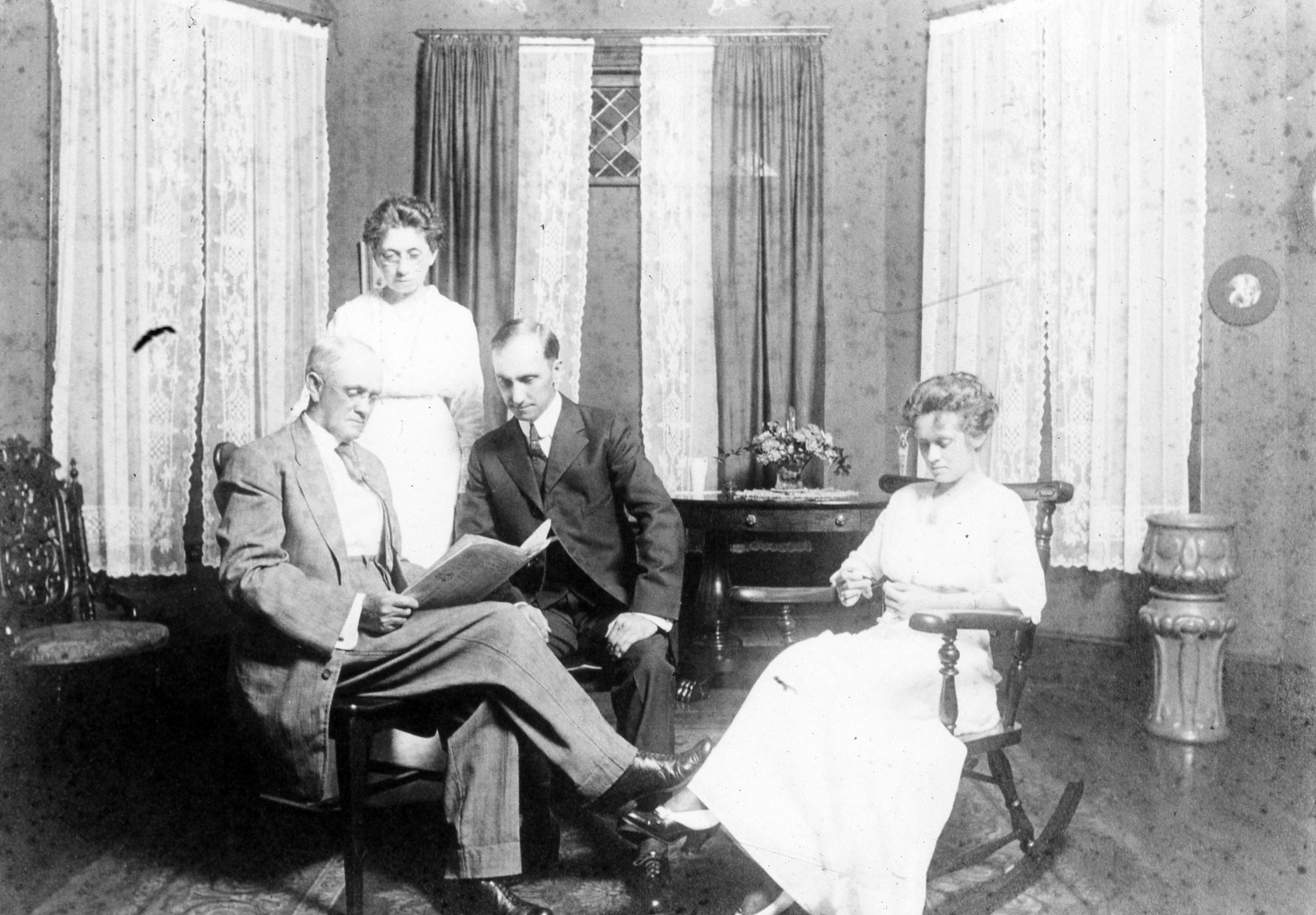 Louis Wade Wilson House: This house is located at 737 E. Church Street. F. J. Schplatter of Evansville, Indiana was the architect of this house. The house was built for Louis Wade Wilson who lived there with his wife Louanna French and their daughter Cecil Pearl (and eventually her husband Edwin Boyer). His father, John Wilson, lived next door just east of his own home at 805 Church Street and his brother, Doctor Thomas Wilson, lived one plat west of his home at 729 Church. Louis Wade Wilson was an insurance agent based in the town. This photo shows the family relaxing in the parlor. Left to right: Louis Wade Wilson (1856-1924), Louanna French Wilson (1860-1945) married in 1877, Edwin E. Boyer (1877-1964), and Cecil Pearl Wilson Boyer (1879-1941). All four are buried in Maple Hill Cemetery in New Harmony.