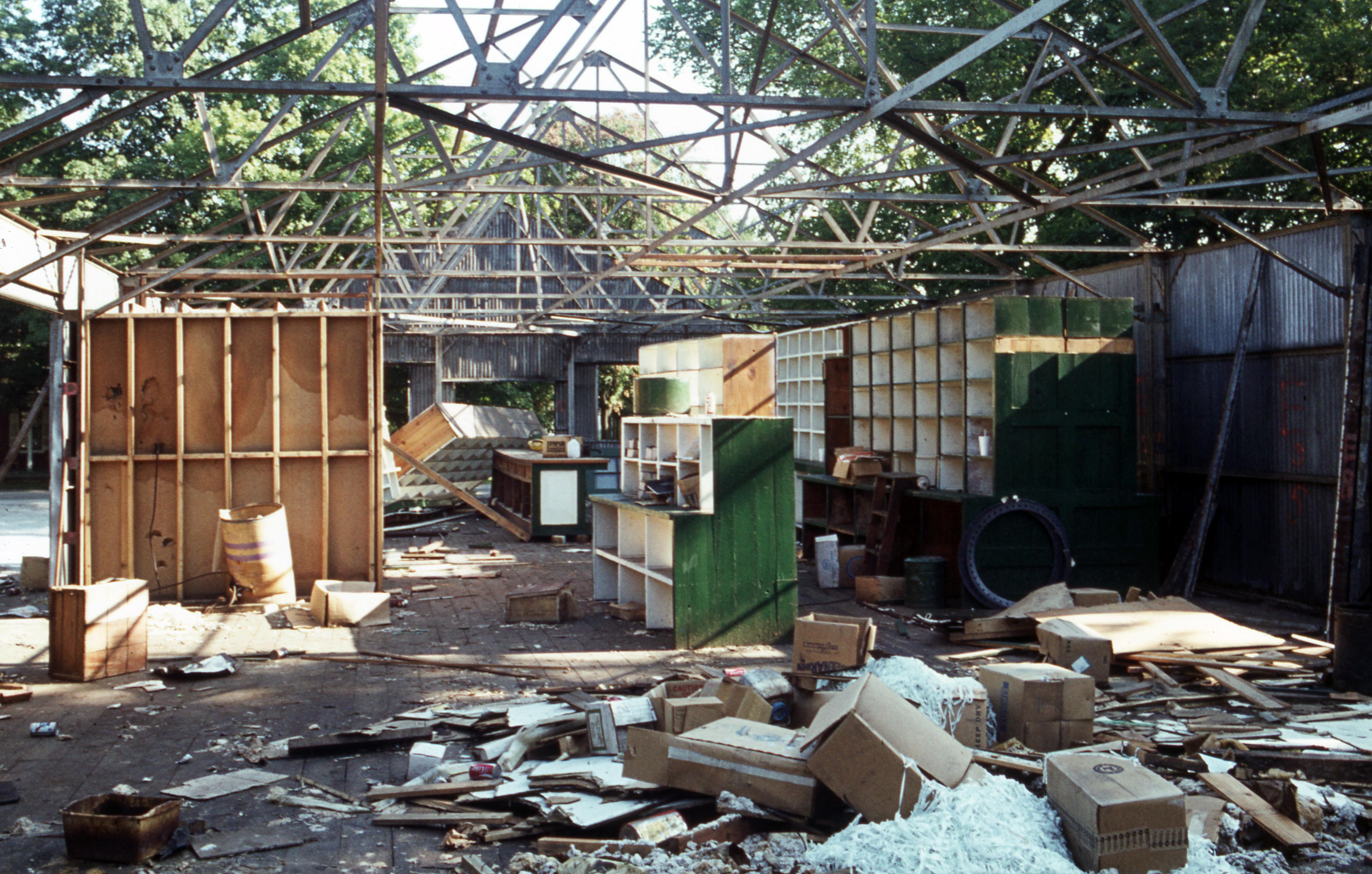 Continental Emsco Company: This building was located on the plat just west of 723 E. Church Street and was dismantled to accommodate the Golden House which was later moved onto this plat. The Continental Emsco Company was incorporated June 4, 1946 in the state of Texas, and dissolution of the company occurred January 31, 1984. The company was in the business of drilling oil wells. This photo shows the inside of the building as it was being dismantled. The old patron counter can be seen at the center front of the building and shelves which held drilling tools can be seen on either side of the photo.