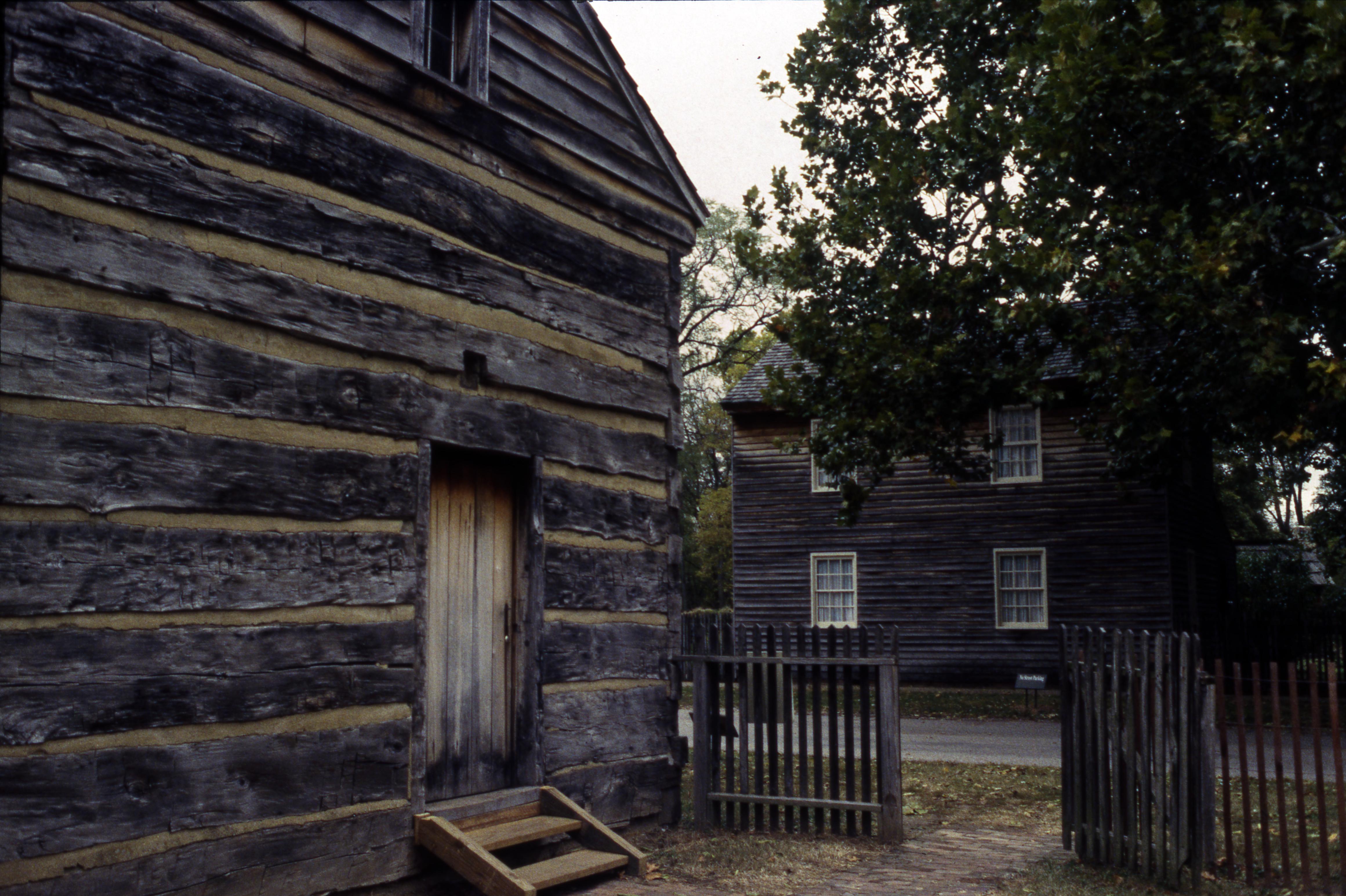 The West Street Log Cabins located at 301 West Street, New Harmony, Indiana. The logs that were used to reconstruct the West Street Log cabins came from the John Spencer log house in Crossville, Illinois.