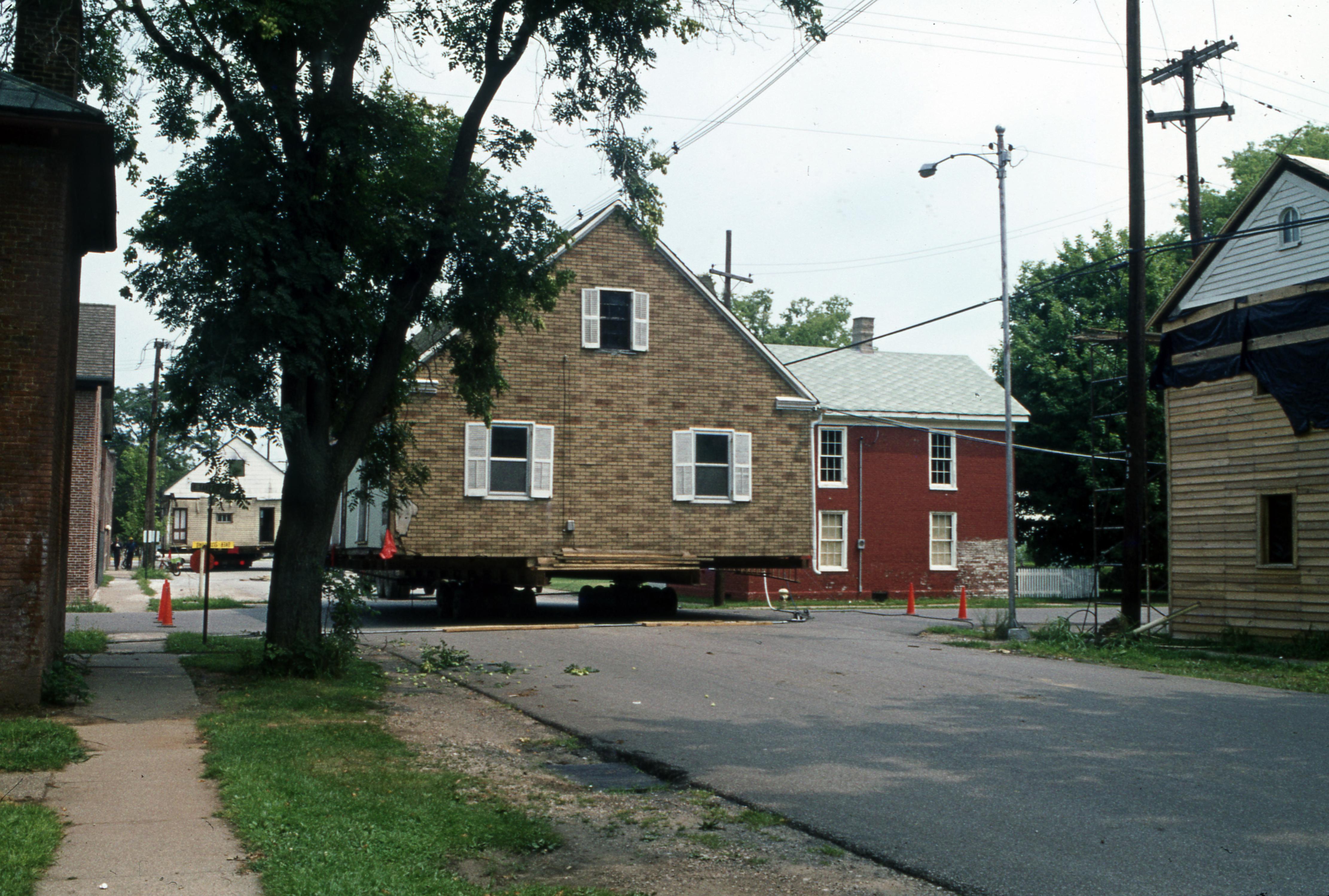 Beal House: The Beal House was moved during the Lanark Construction, on Town Block 8 E/W on Main Street to 611 Church Street. The Beal house was constructed around 1829 by John Beal, who was a carpenter in the Owen and Maclure community. Beal constructed the house from lumber and timbers from an older horse barn. The new location would be the site of the Beal House and 1850s Doctor's Office (The Doctor's Office was a remodel of the Kemmerling House, which was also moved to this site). Elmer Buchta Moving Engineers was contracted for this and many other building moves during the 1970s. In this photo the house is in the intersection of Brewery and Tavern Streets. Ahead of the Beal is the Cooper Shop, which was headed to its new location across Church Street in front of the Theater Barn.
