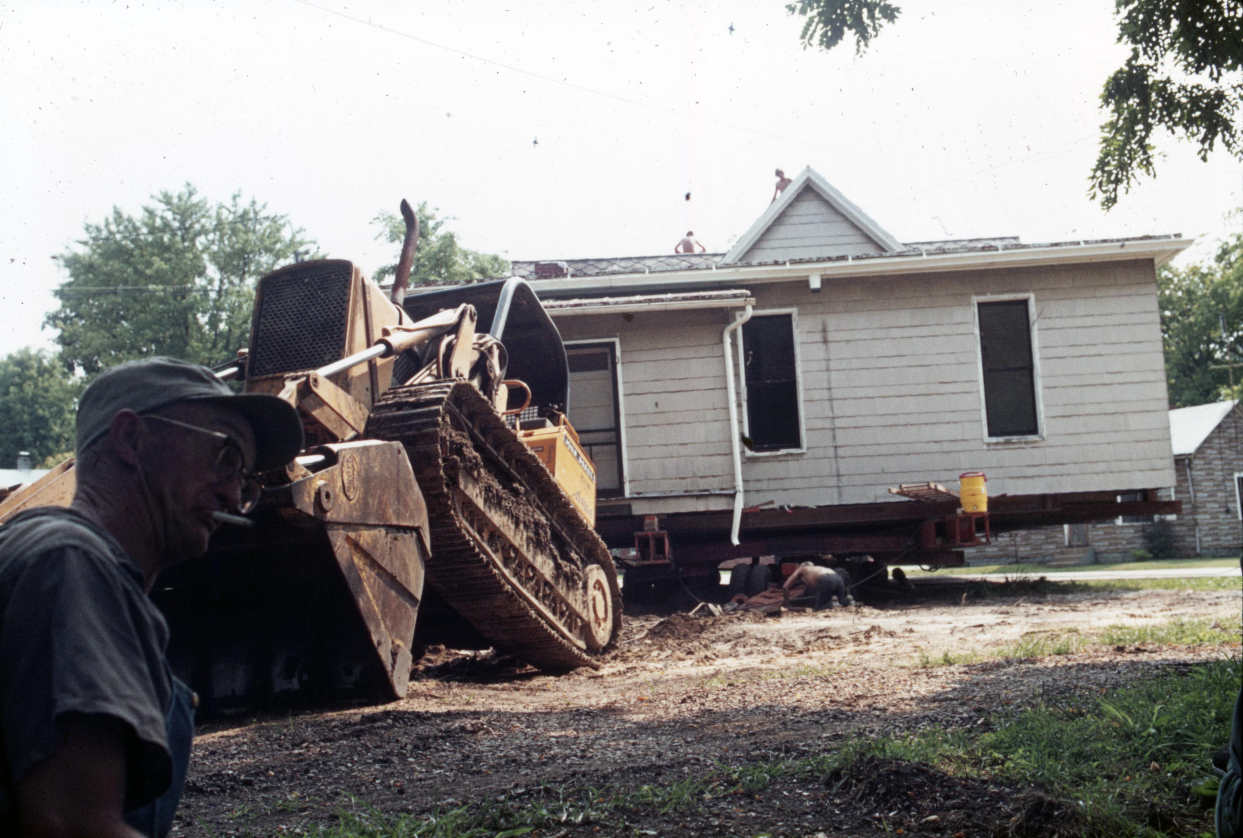 Barrett House Move: This house was originally located at 1826 Main Street but was then moved to 604 South Street during the Lanark Construction. Elmer Buchta were the movers. A bulldozer stabilizing the leaning house as the movers make the turn toward the 604 South Street plat.