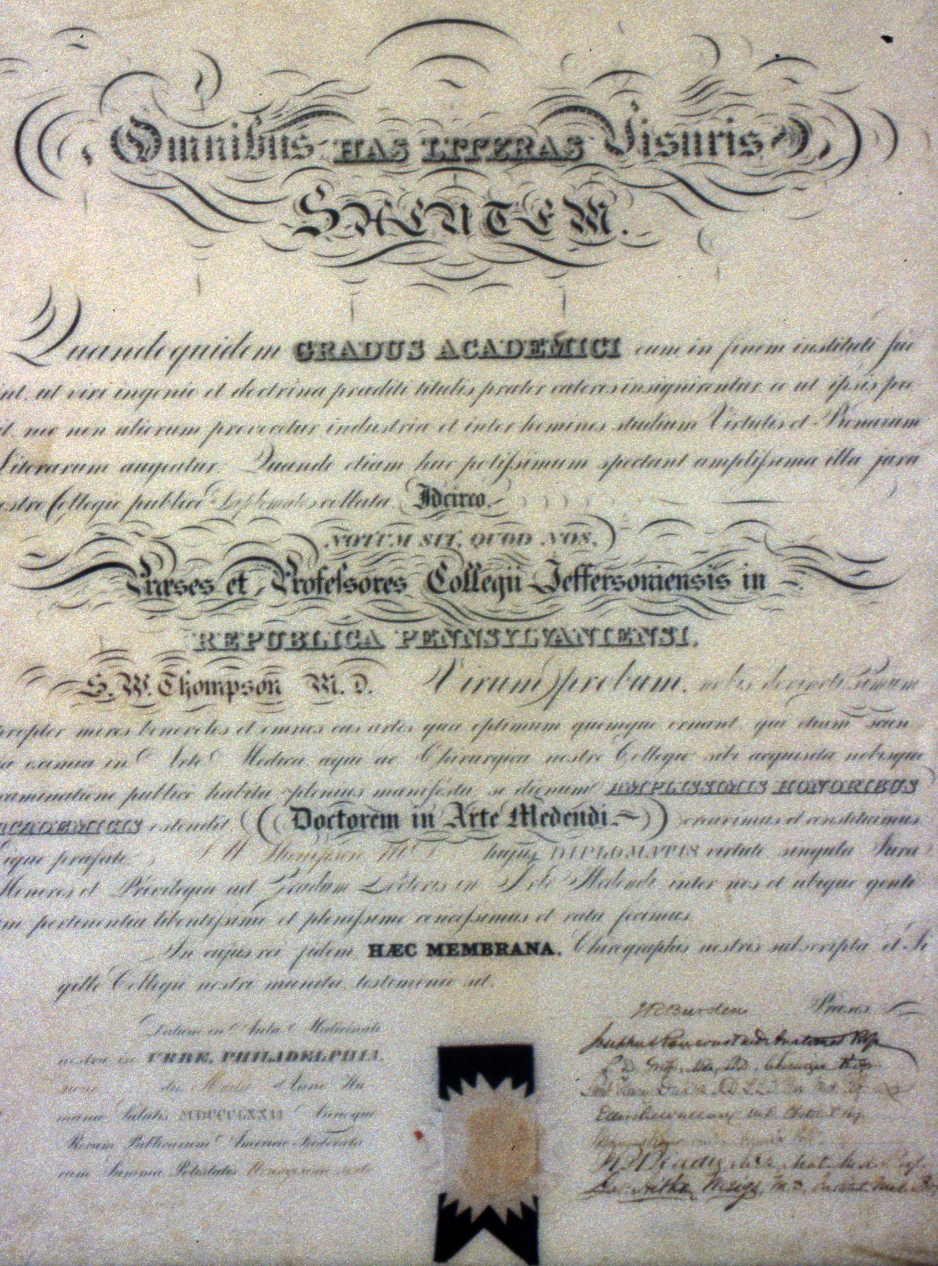Kemmerling House/1850s Doctor's Office: The Kemmerling House was relocated from town Block 4 J/SE to the new location at 611 Church Street, beside the Beal House. The Kemmerling House was remodeled into the 1850s Doctor's Office, a gift to the town of New Harmony from Mead Johnson. The Kemmerlings were listed in the 1882 Posey County Directory (as Kimmerlin) as being New Harmony Township farmers. Elmer Buchta Moving Engineers was contracted for this and many other building moves during the 1970s. This photo shows the certificate of a degree in Doctor of Arts in Medicine. Part of the gift of the 1850s Doctor's Office from Mead Johnson.