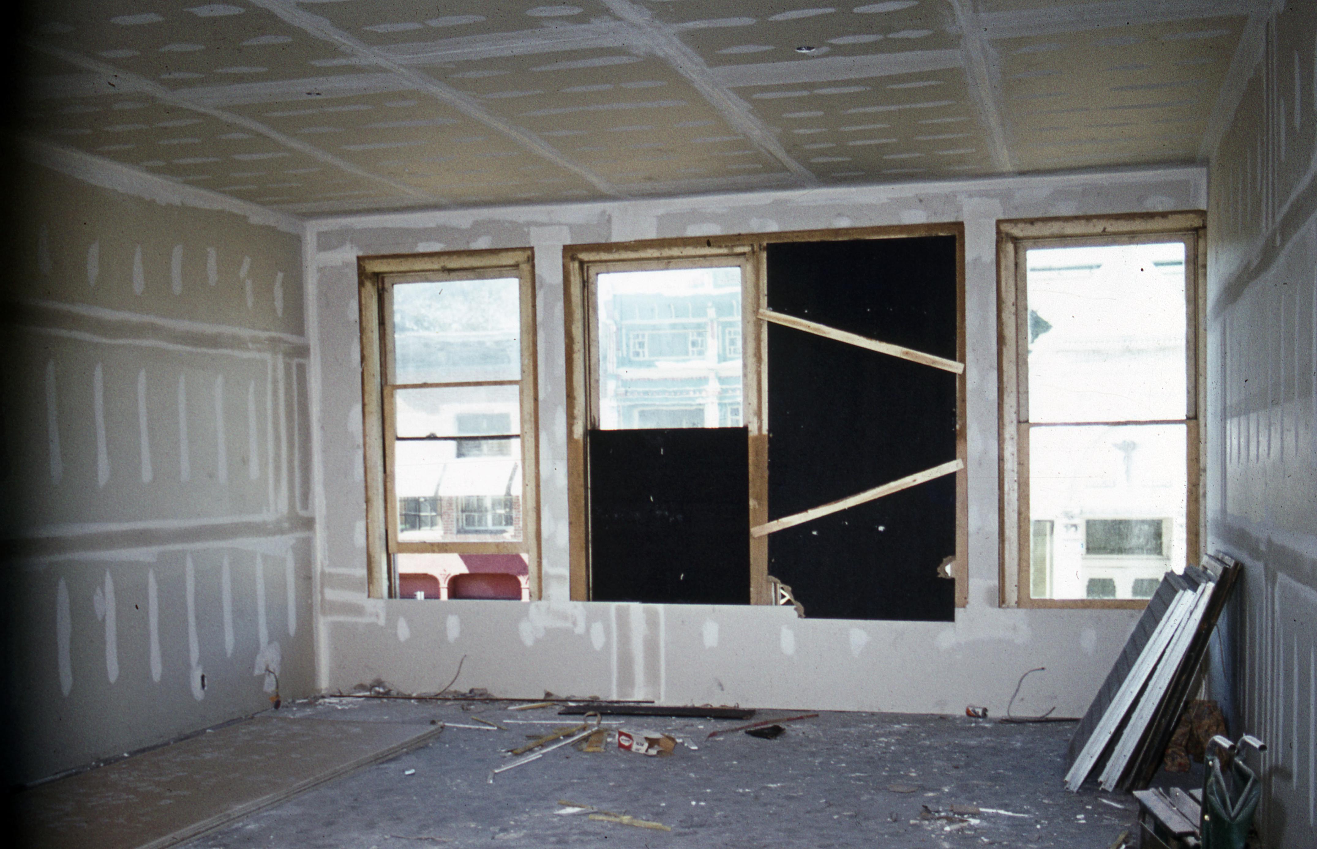 J. Breith Building: This building is located at 506 Main Street. The building started as a one-story wooden structure built by Jacob Breith (UA58 � 7516 far left) as a pharmacy and grocery store. The original building was demolished to make room for the new two-story brick structure at some point between 1893 and 1899. The Historic New Harmony Office was located on the second floor of the building in the early 1970s. The Kopper Kettle Gift Shop was located in the J. Breith Building during the early 1970s. After the J. Breith Building was renovated, it became home to the Imoko Plants shop, very briefly, before becoming a part of the New Harmony Gallery of Contemporary Art as the sales floor. This photo shows the interior second floor of the building during renovation work.