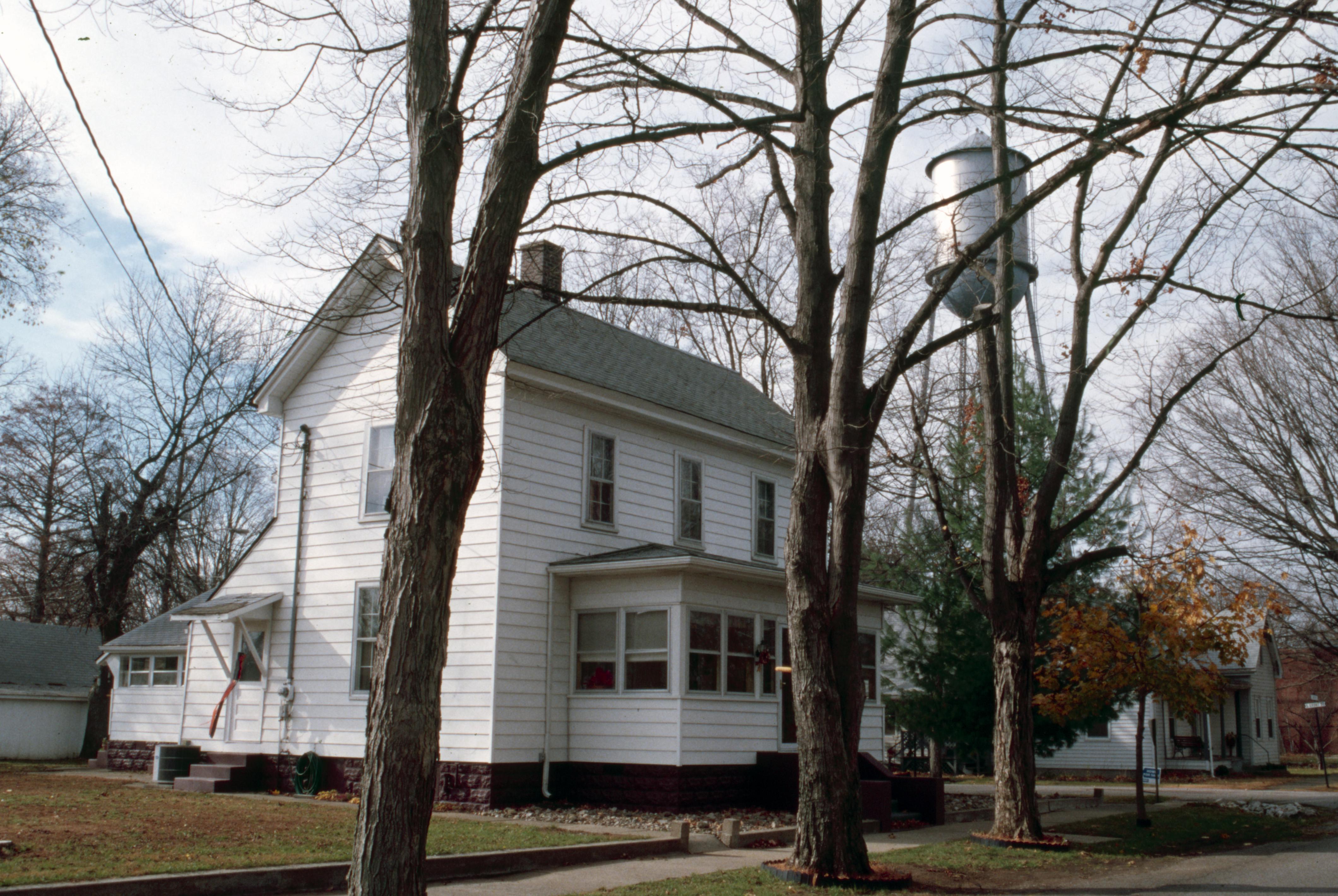 Streets: This house is located at 803 Tavern Street on the corner of Short and Tavern and was constructed in 1910. In the background on the right side of the photo, across Short Street, is the old town water tower, now demolished, located behind first the old New Harmony Light and Power Station then the firehouse and now a vacant building.