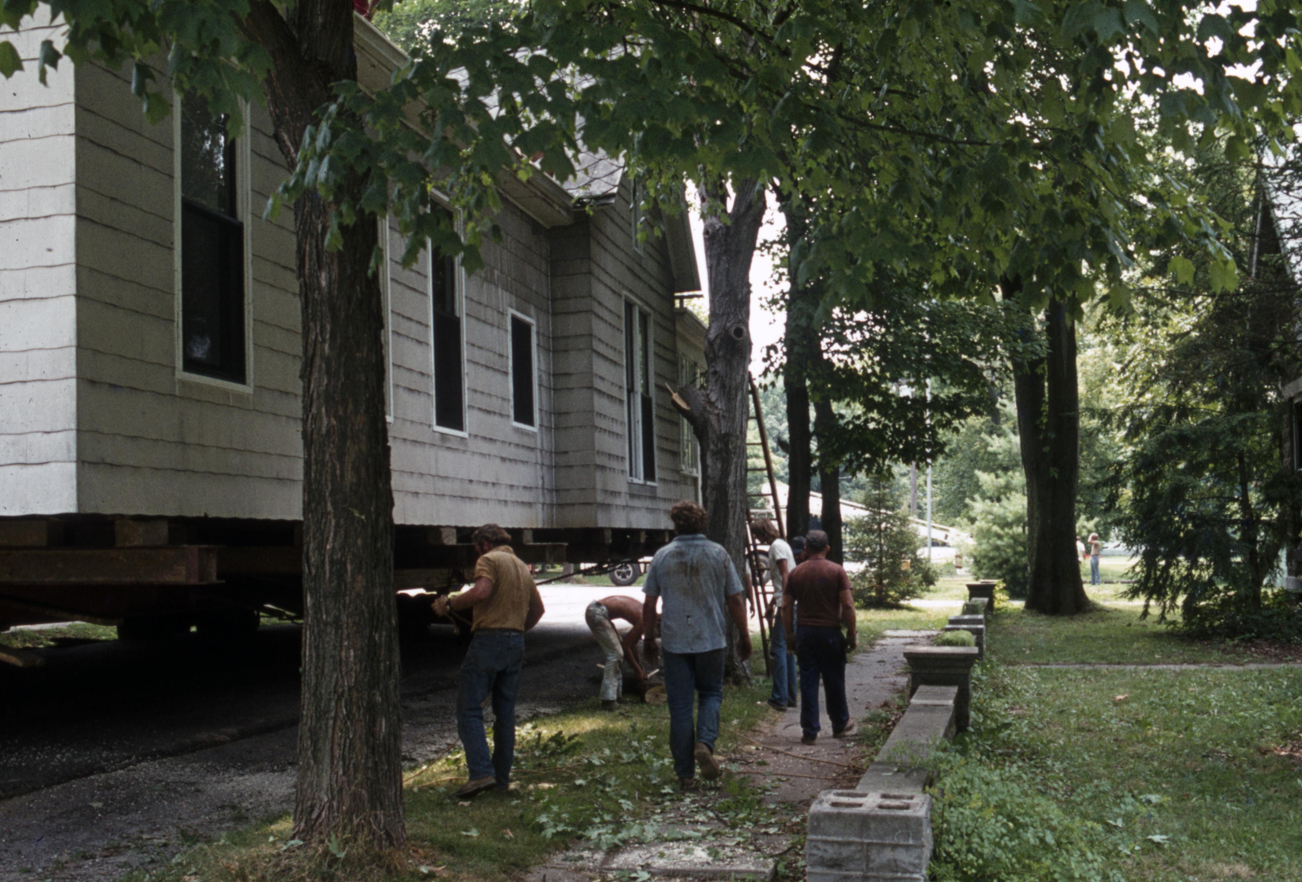 Barrett House Move: This house was originally located at 1826 Main Street but was then moved to 604 South Street during the Lanark Construction. Elmer Buchta were the movers. Workmen trimming trees back so they can move the house north on Brewery Street.