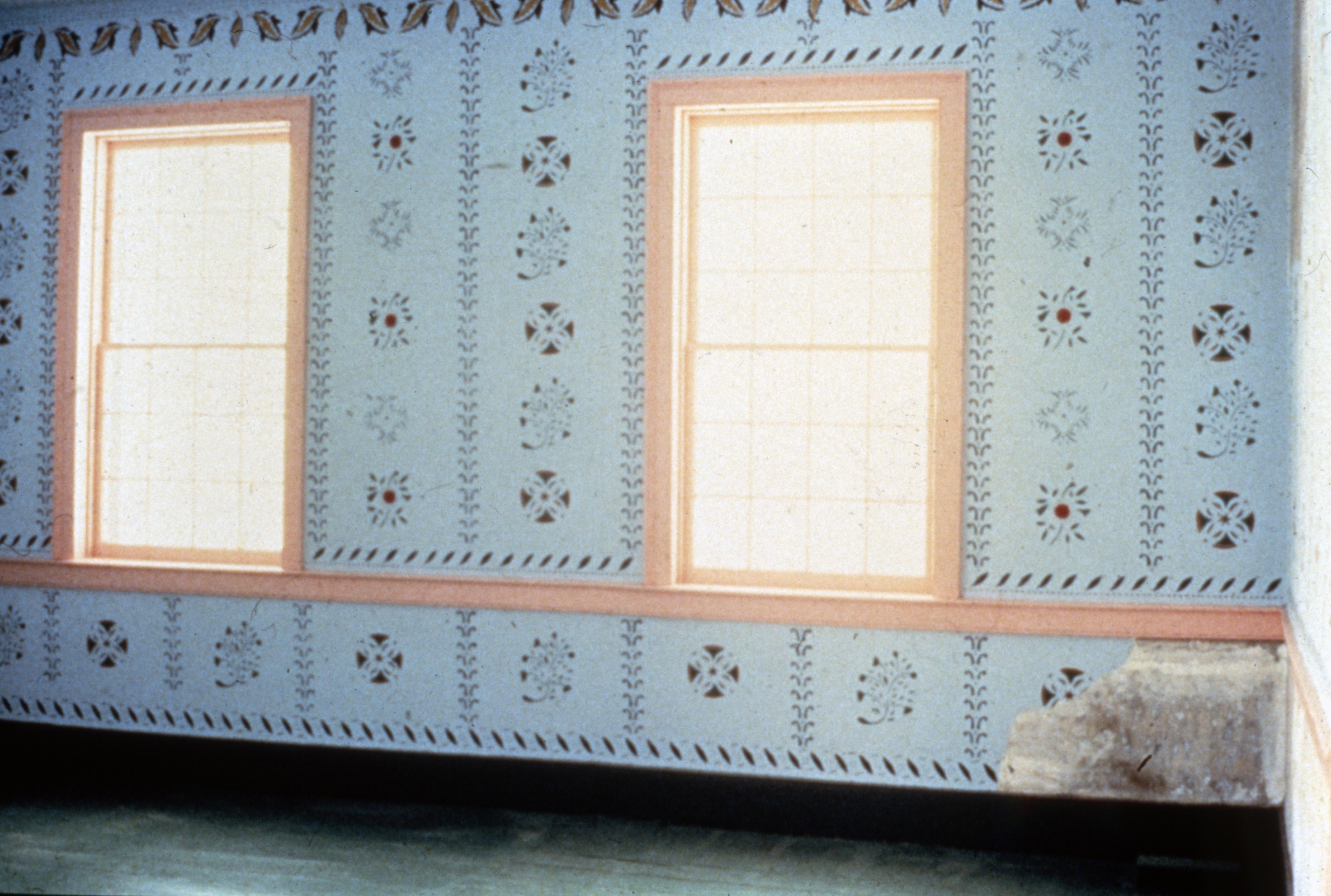 The Jaquess House: This is a photo of the Jaquess House, from which the parlor was taken, was moved from somewhere near Poseyville. It was then taken through a field to near the edge of a highway where it was dismantled. The parlor was then incorporated into the Owen House on the corner of Tavern and Brewery Streets in town block 6 E east. This is the refinished parlor after being incorporated into the 1830 Owen House. The designs on the walls are painted on with stencils cut in period patterns that match the exposed part on the right side of the wall where traces of the original can still be seen.