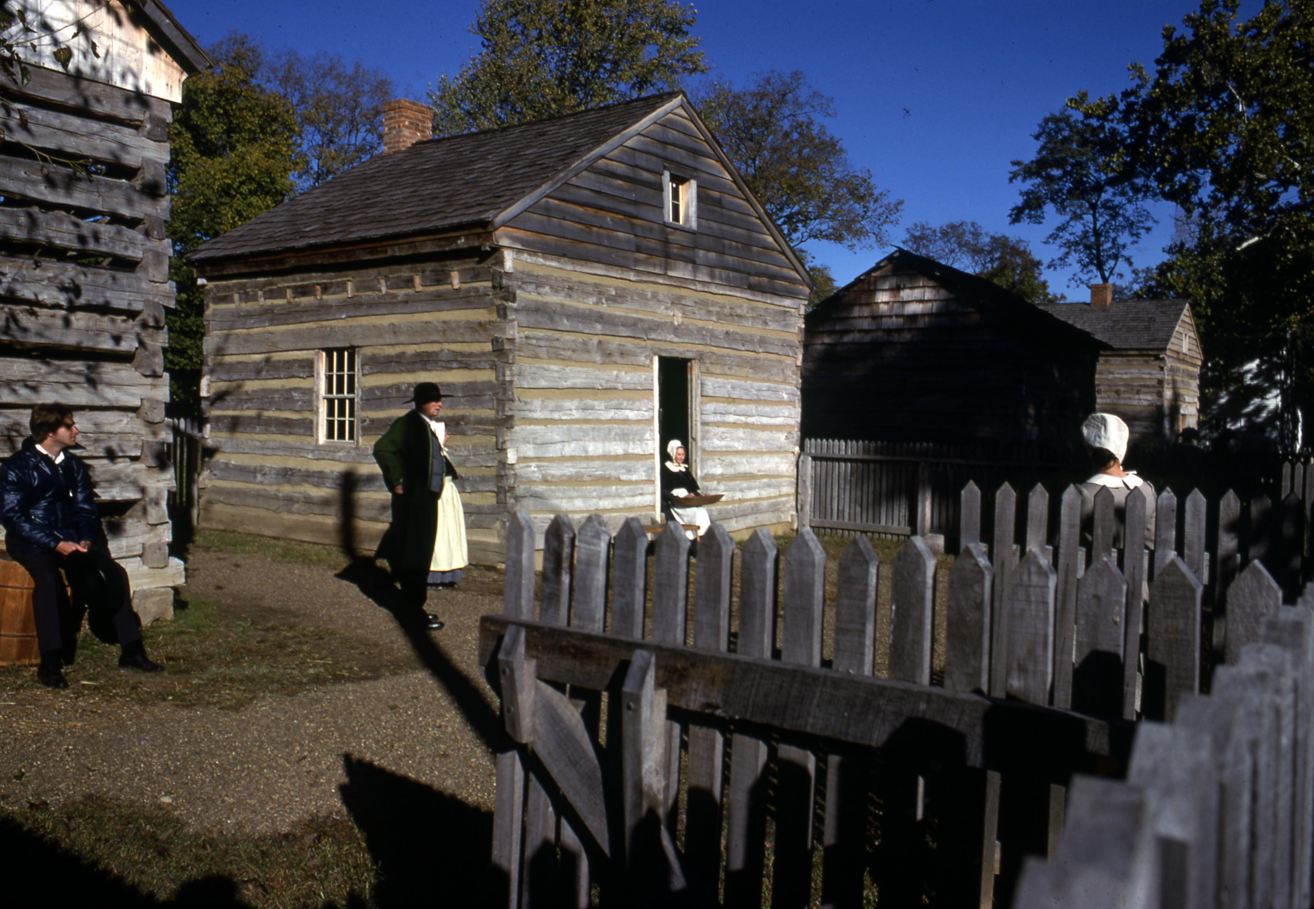 The West Street Log Cabins located at 301 West Street, New Harmony, Indiana. The logs that were used to reconstruct the West Street Log cabins came from the John Spencer log house in Crossville, Illinois.