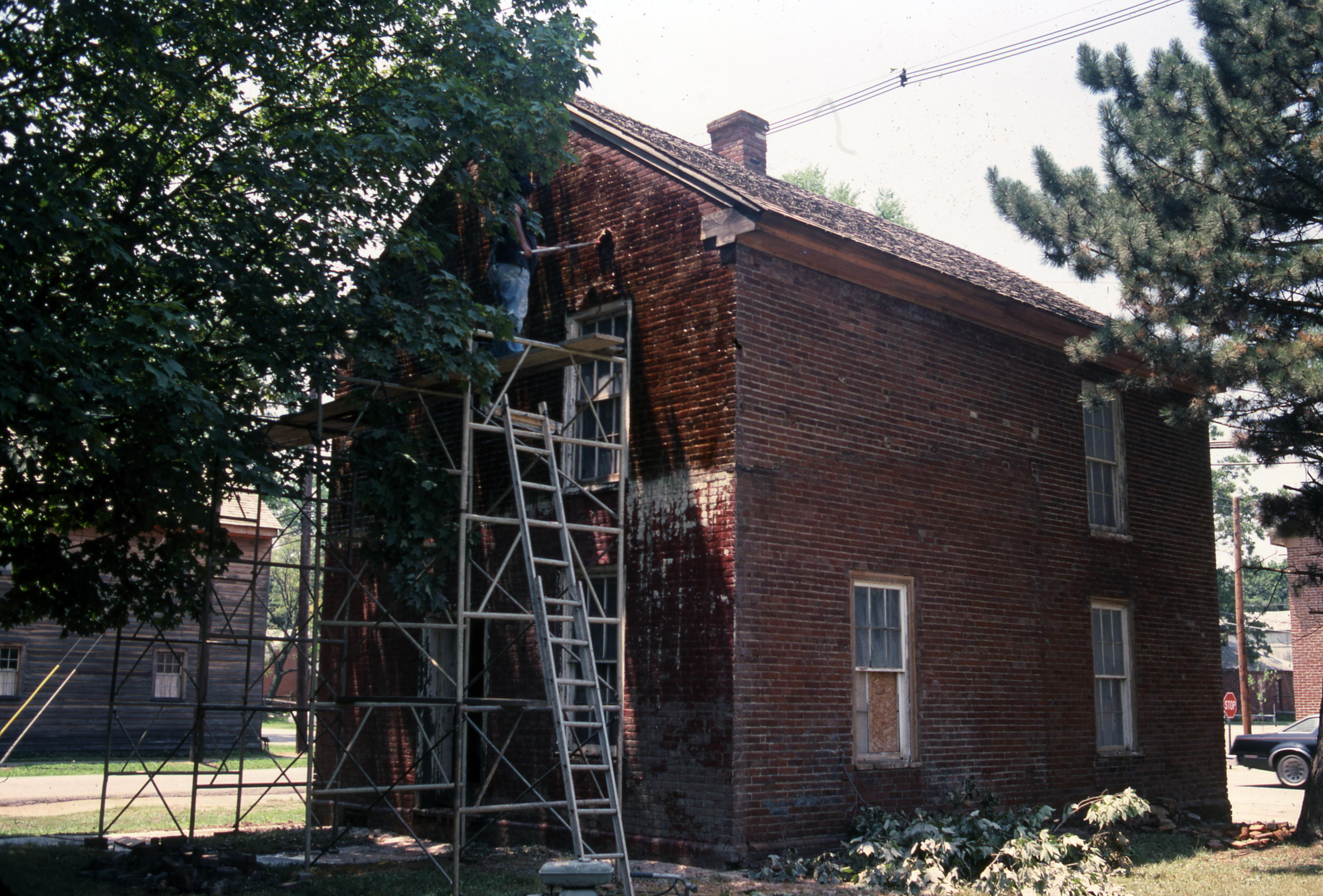 Scholle House: The Scholle House is located at 604 Tavern Street. The house originally belonged to Mathias Scholle, an original Harmonist settler, who was a shoe maker. This building still sits in its original location at the corner of Tavern and Brewery Streets. This photo shows the east wall of the house as the old paint was being stripped away. The north wall has already been cleared of old paint.
