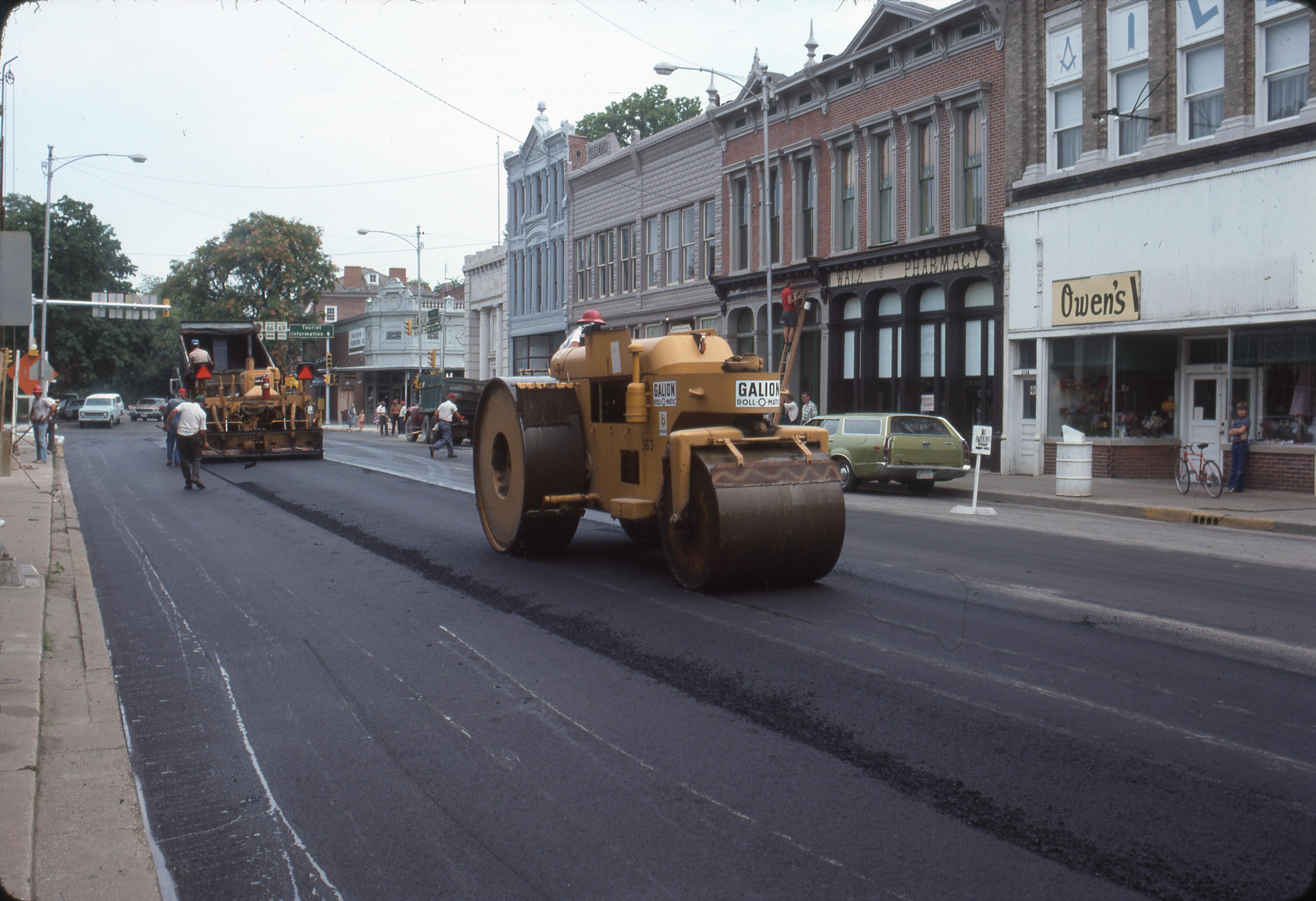 Streets Collection: Main Street. This photo shows Feigel Construction Corp workmen paving Main Street facing toward the north. On the right side of the photo is Owen's Variety store, Walz Pharmacy, The Lemon Tree, the Harmony Bank and Trust Co., and across Church Street is Wilson Furniture Co.