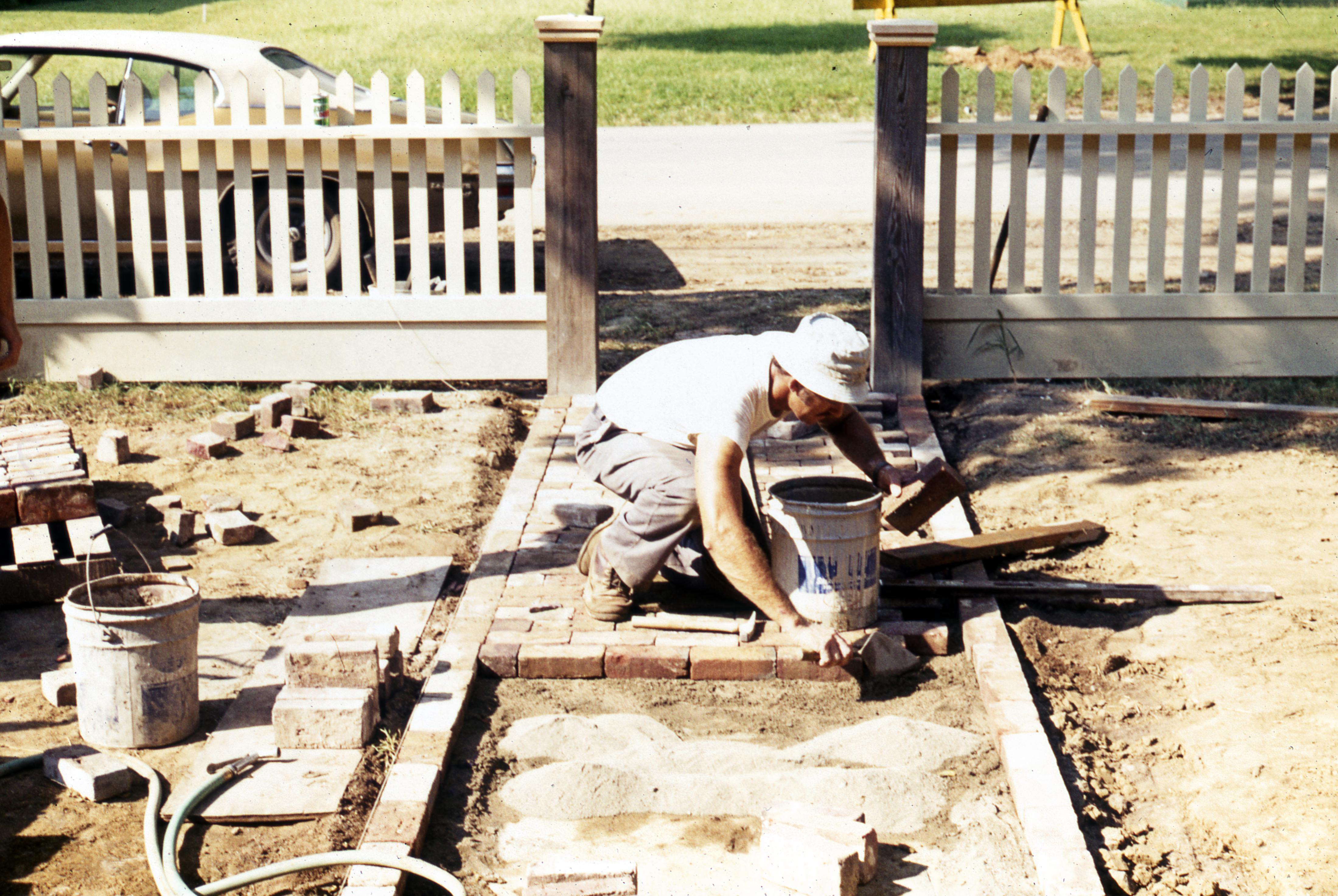 Orchard House: Worker working on walkway as part of renovations to the Orchard House.