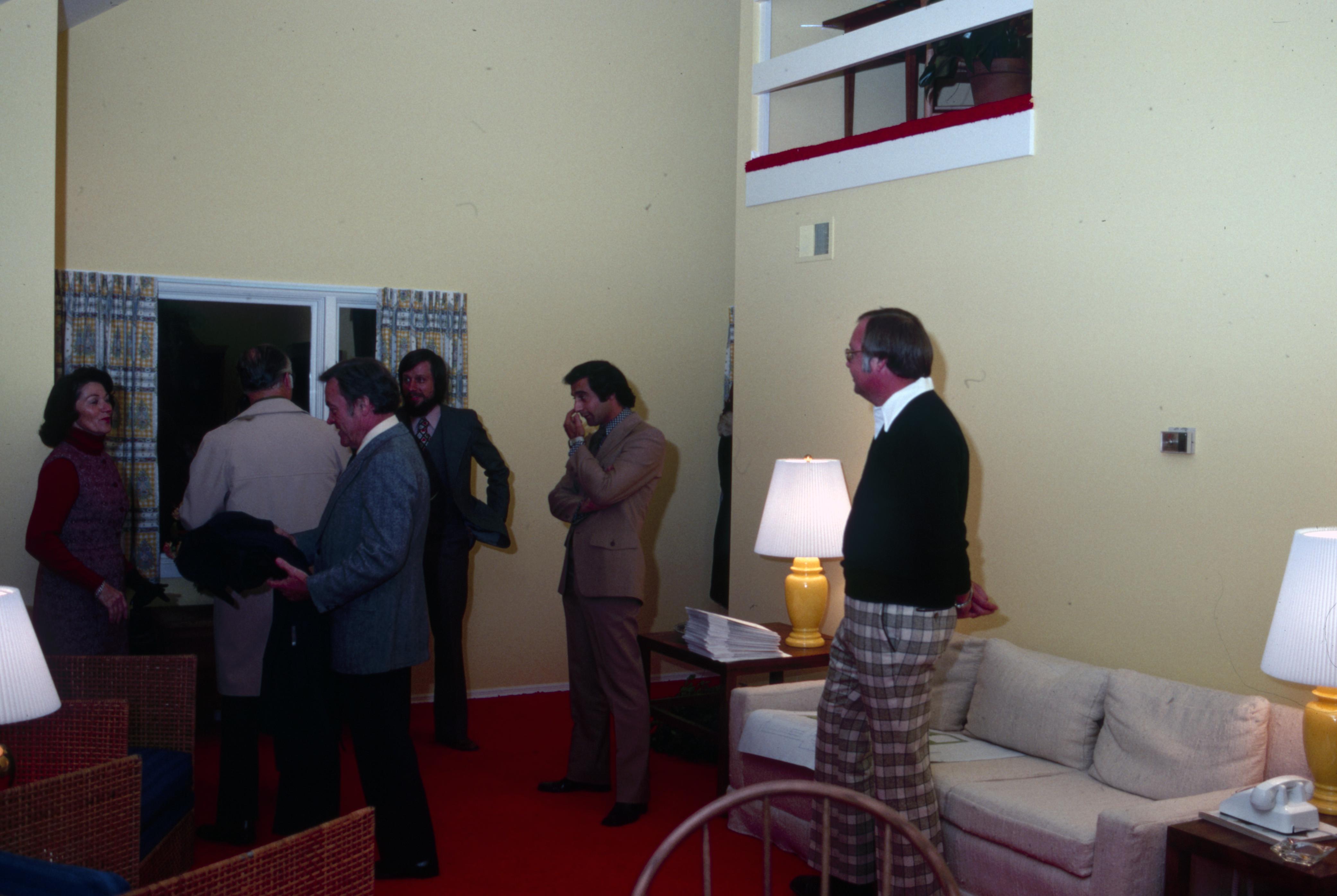 Lanark Development Collection: Construction of 820 Main Street New Harmony Indiana. Finished room interior. Yellow walls, red carpet, blue cushions. People viewing the open house.