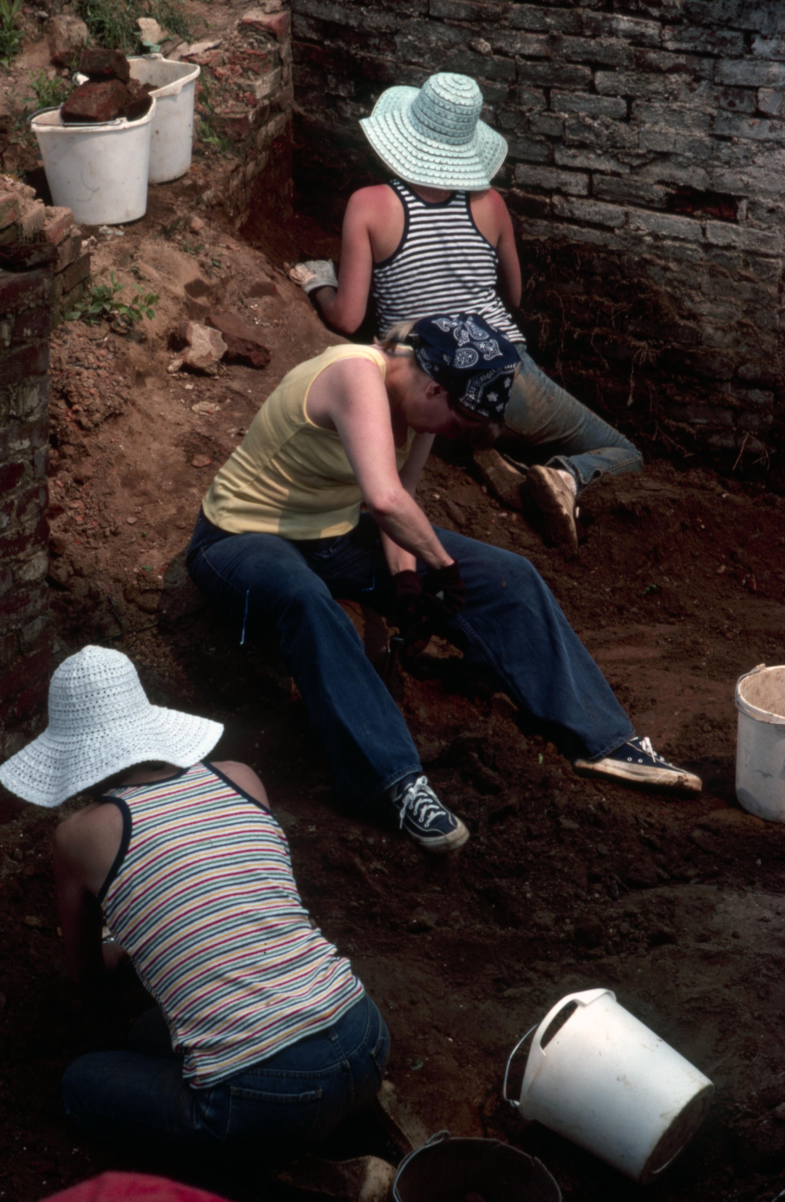Indiana State University Evansville Archaeological Dig Collection: Russell(Kepler) House. This location was on the bend where Arthur Street merges with North Street. These buildings were moved or demolished to construct the Historic New Harmony Atheneum and parking plat. A group of people working on the dig site.