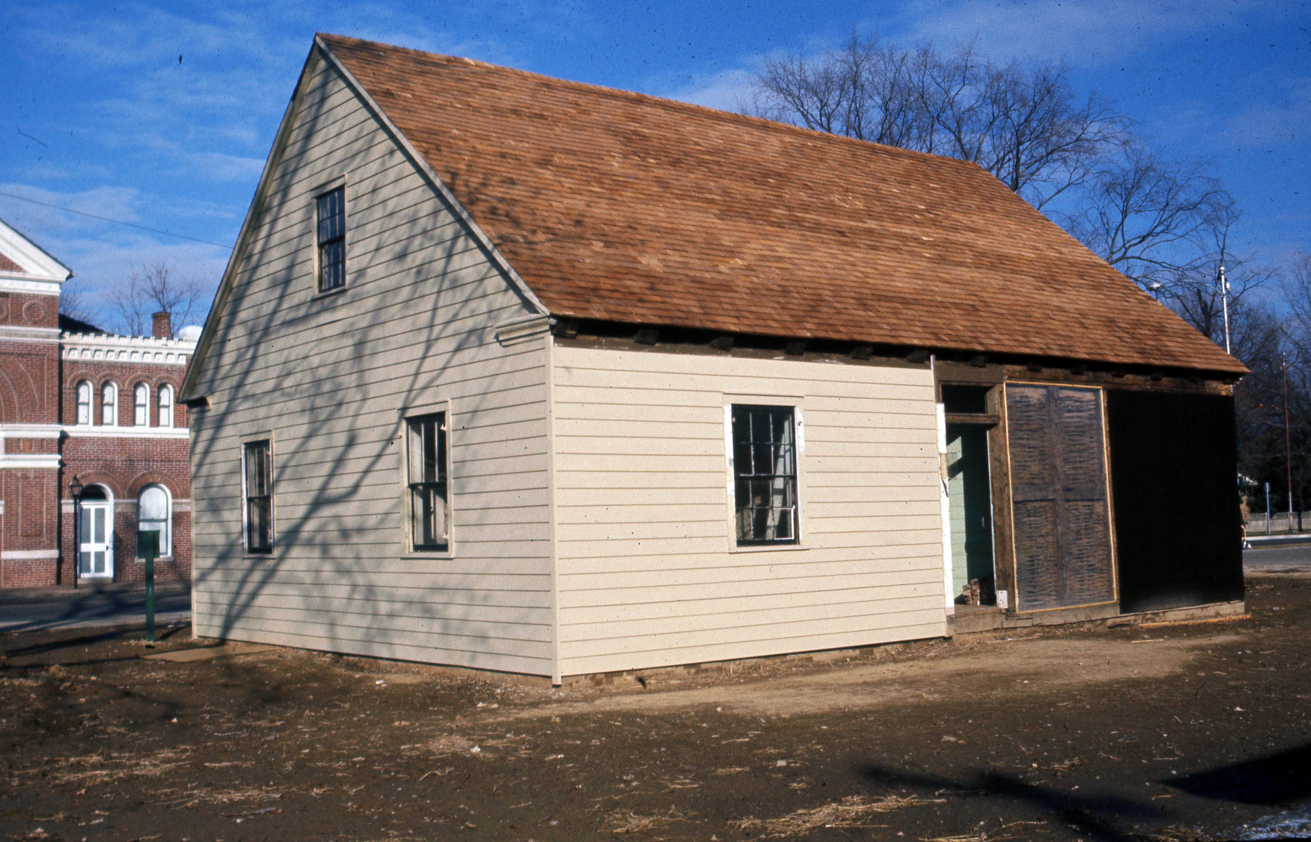 Beal House: The Beal House was moved during the Lanark Construction, on Town Block 8 E/W on Main Street to 611 Church Street. The Beal house was constructed around 1829 by John Beal, who was a carpenter in the Owen and Maclure community. Beal constructed the house from lumber and timbers from an older horse barn. The new location would be the site of the Beal House and 1850s Doctor's Office (The Doctor's Office was a remodel of the Kemmerling House, which was also moved to this site). Elmer Buchta Moving Engineers was contracted for this and many other building moves during the 1970s. This photo shows the southwest corner of the house after the new clapboards were put in place.