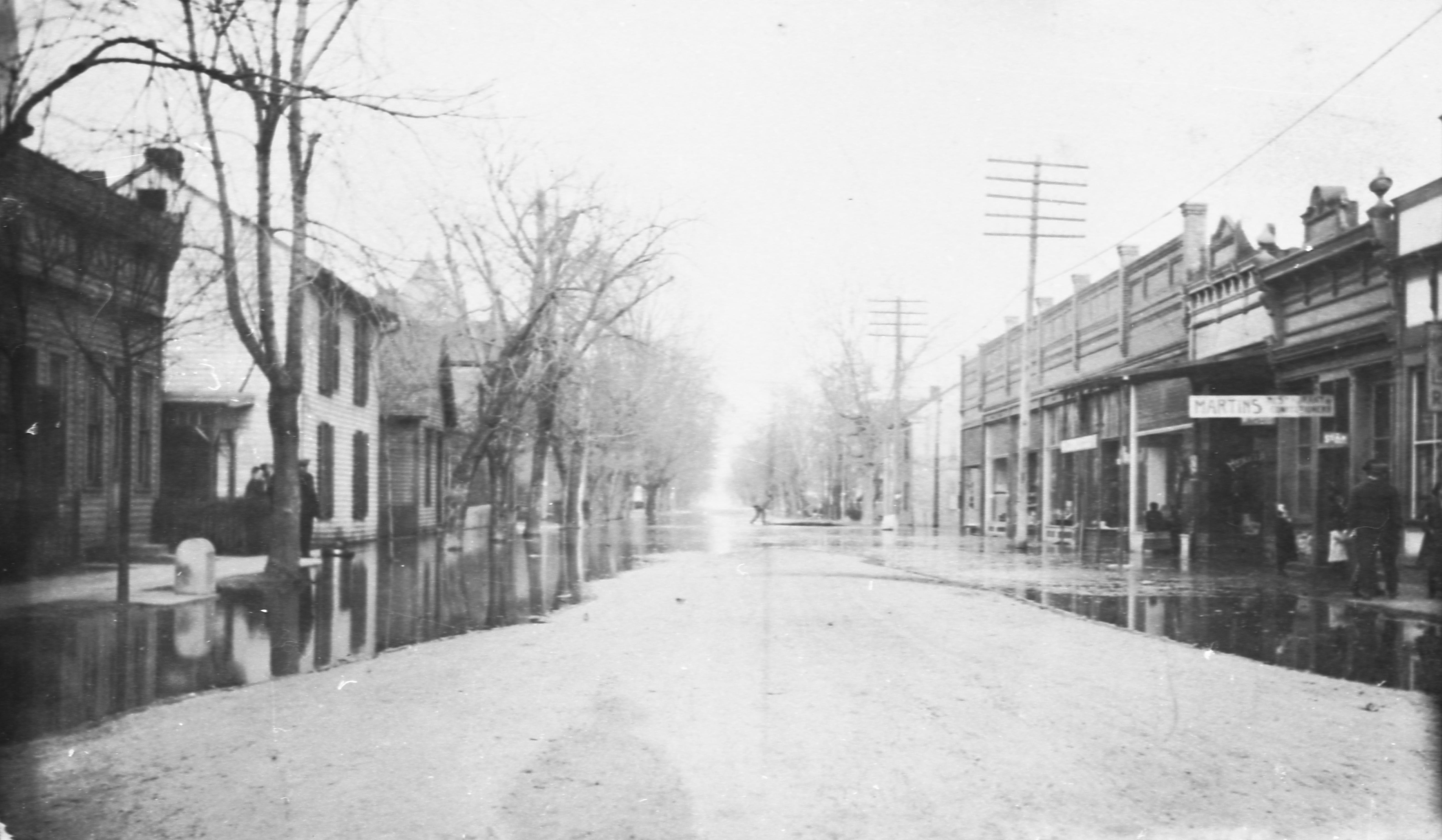 Transparencies and Negatives Collection: Historic photographs. 1913 Flood: On March 24 and 25 of 1913 the Wabash River had produced a large flood, which inundated the town of New Harmony, from torrential rains and storms which had also produced tornados across the mid-west United States. At its height it measured 27 feet 10 inches. This photo is of Church Street, facing toward the east, and was probably taken from a position in front of the Tavern Hotel.